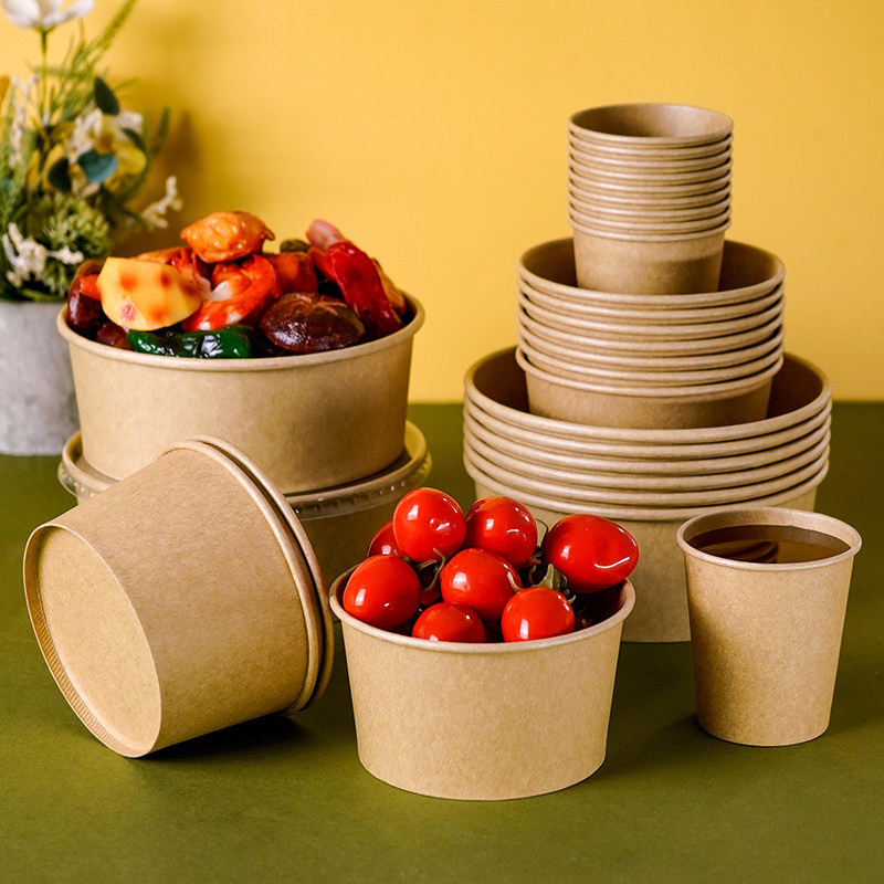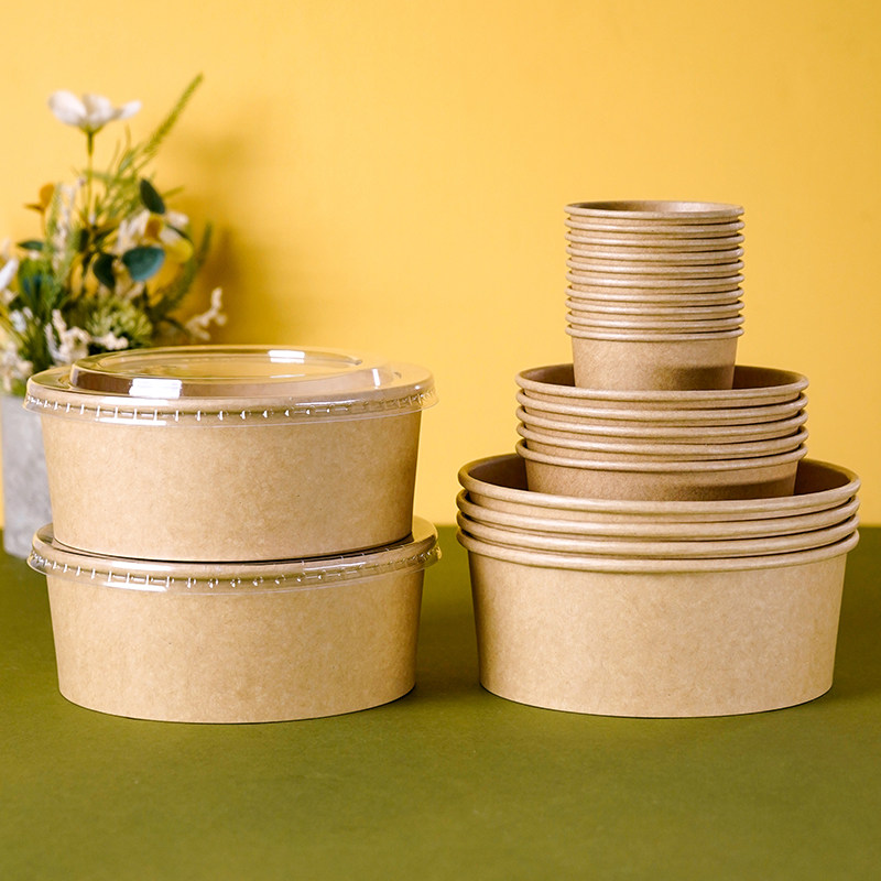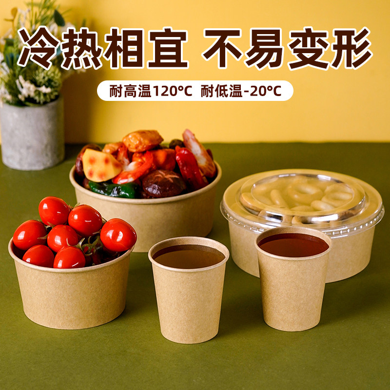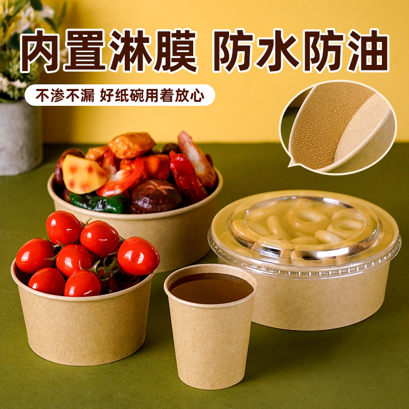 牛皮纸碗一次性野餐盒沙拉碗带盖外卖打包盒露营水果盒圆形纸碗