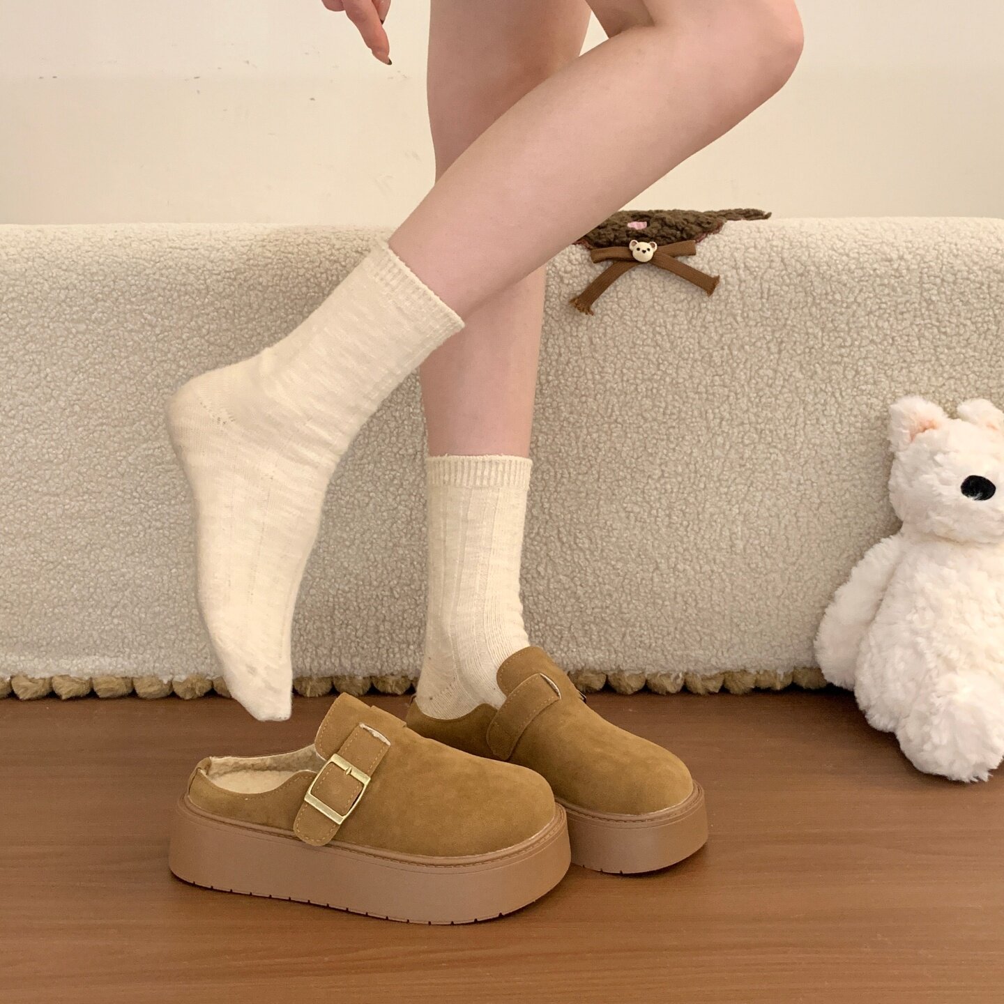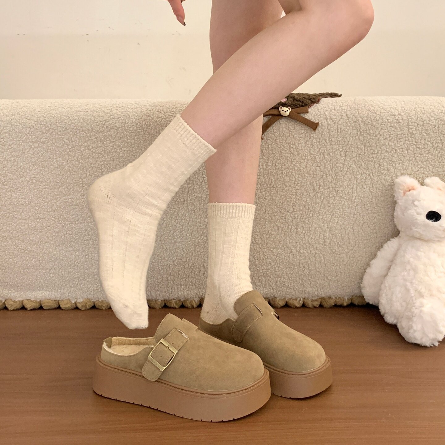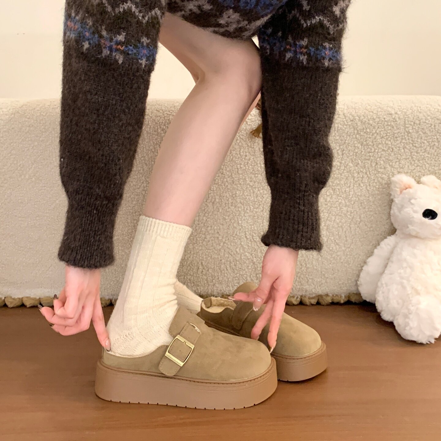 品牌清仓真皮勃肯包头半拖鞋女2025冬季新款加绒棉拖厚底雪地棉鞋