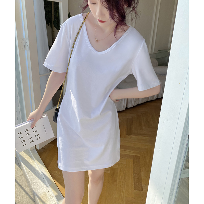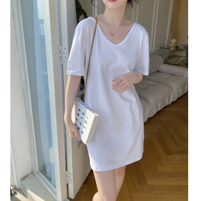 白色连衣裙女夏2026新款纯棉休闲懒人裙小个子中长款V领T恤裙子