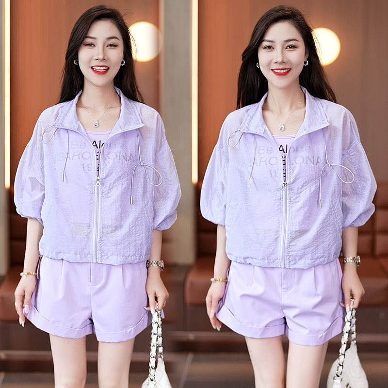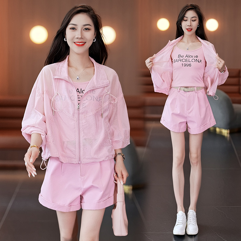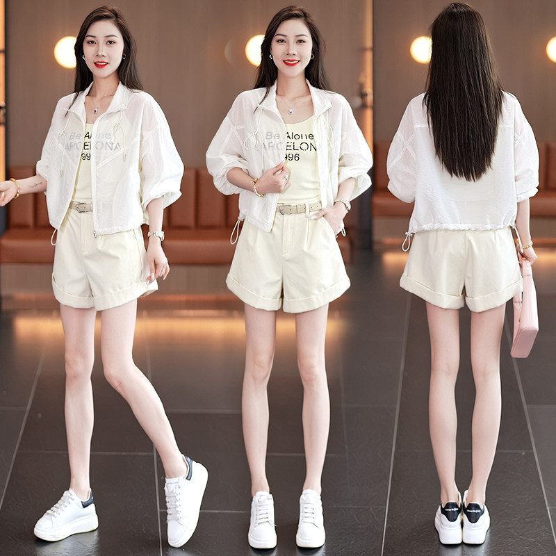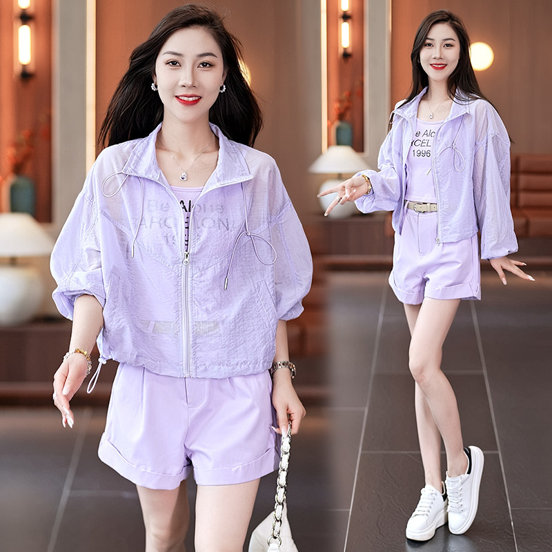 小个子长袖高腰短袖套装女时尚减龄洋气运动服宽松防晒三件套