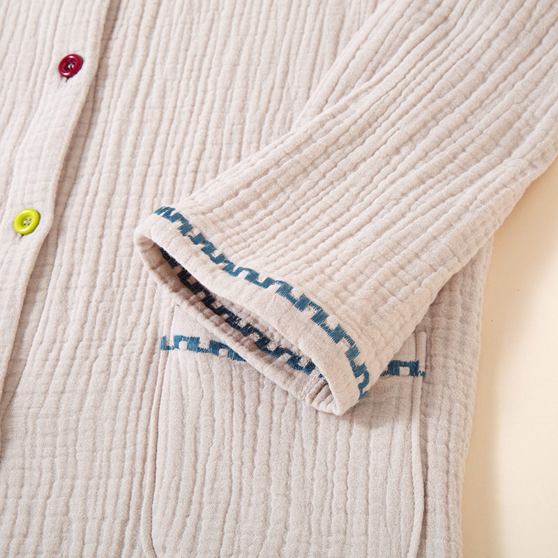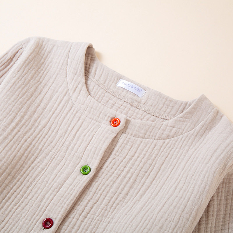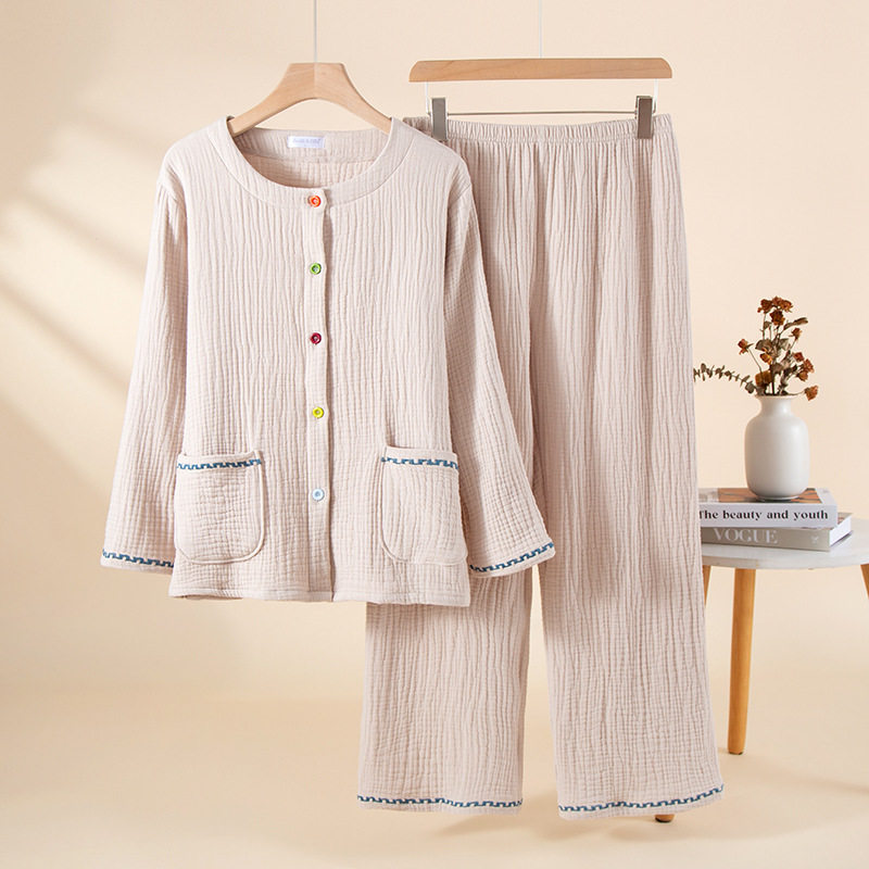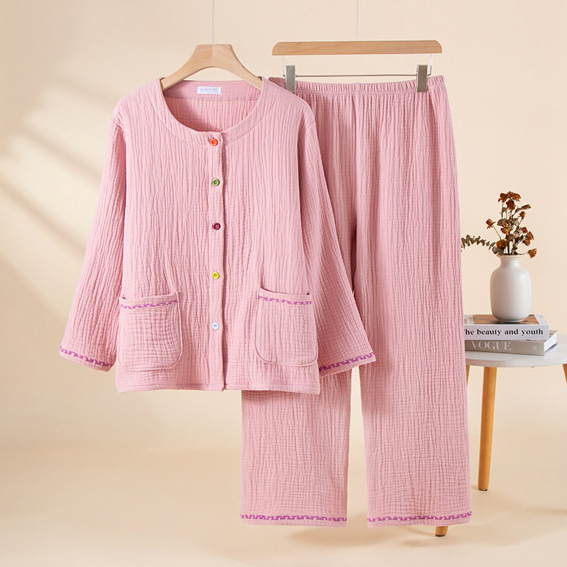 四层加厚纯棉纱布女款圆领纽扣开衫套装睡衣宽松家居服套装可外穿