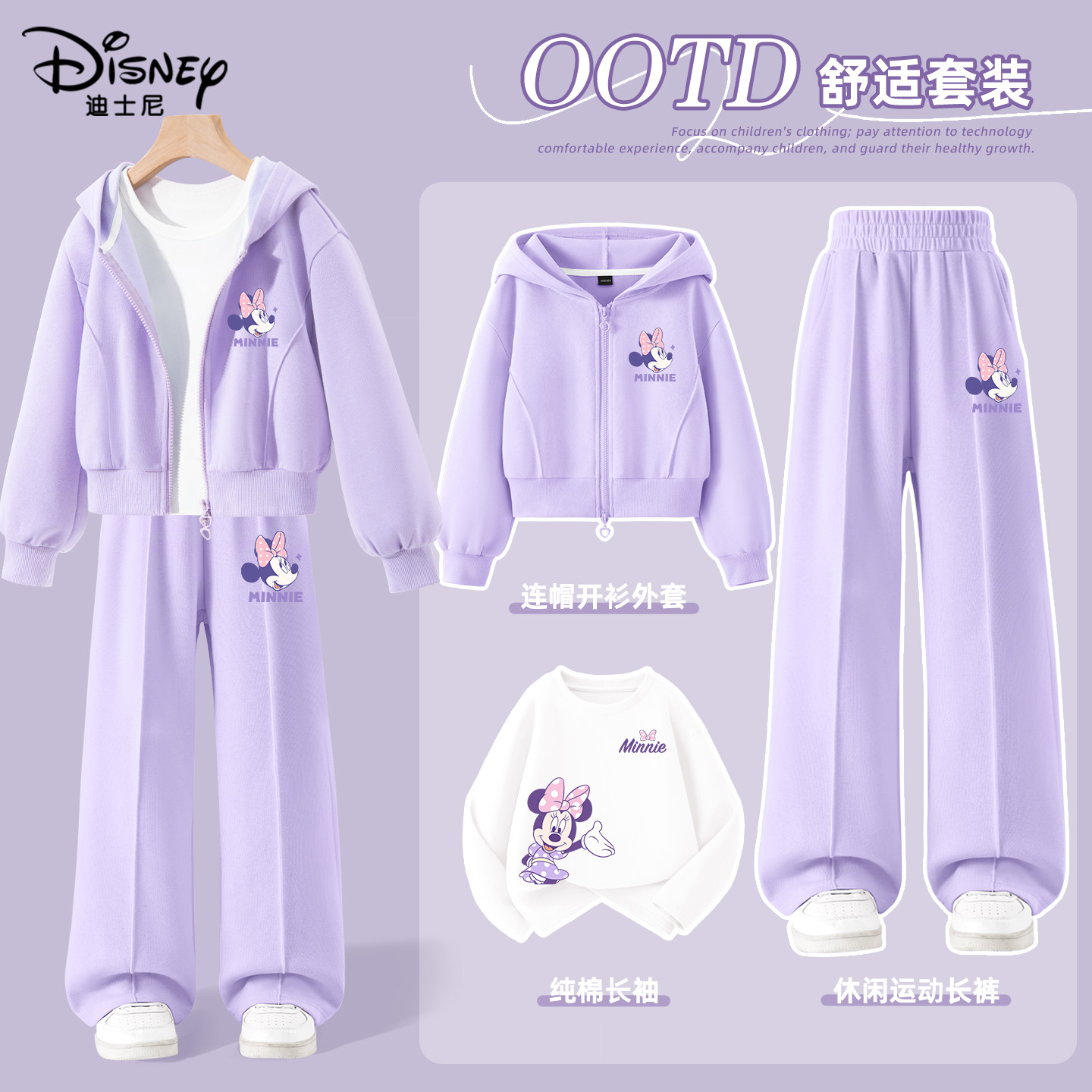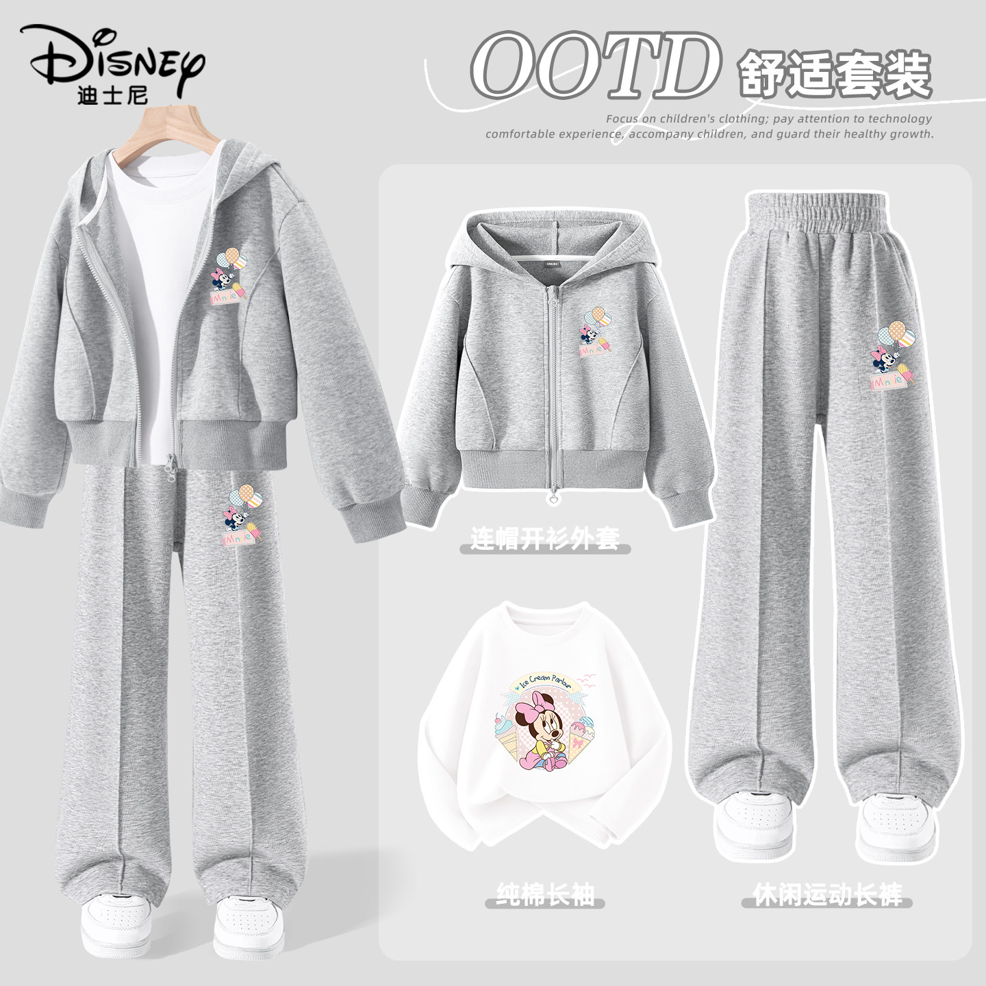 迪士尼女童秋装卫衣套装2026新款女孩春秋连帽外套儿童运动三件套