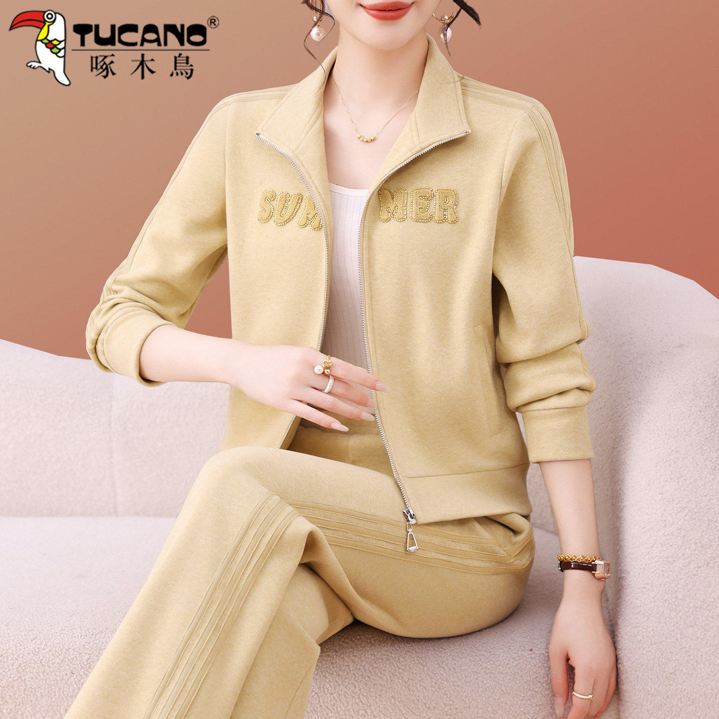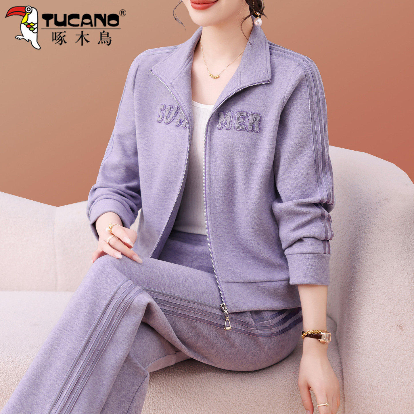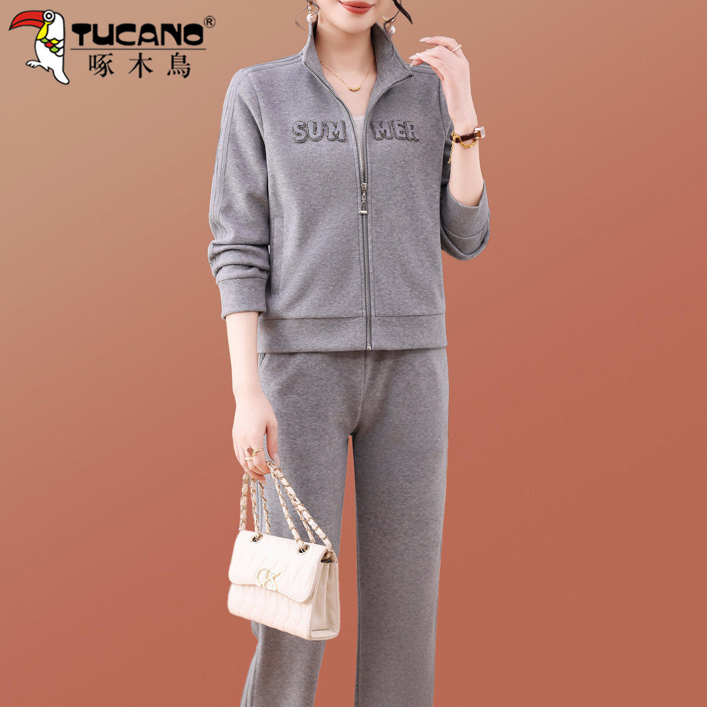 啄木鸟妈妈秋装灰色运动套装2026新款女士开衫立领外套休闲两件套