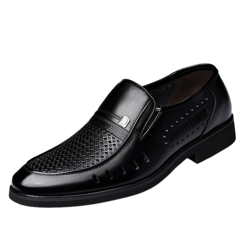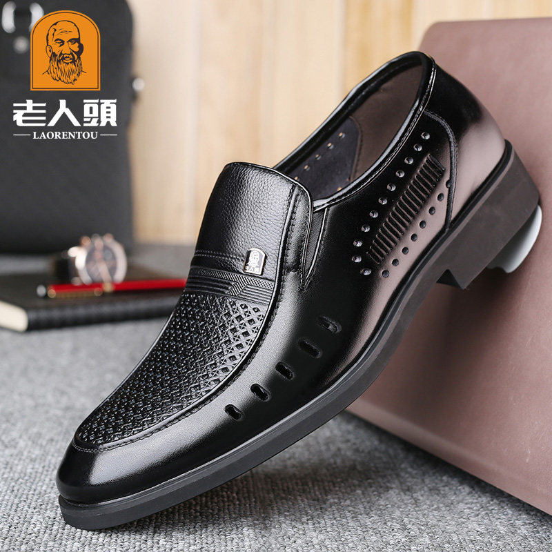 老人头夏季内增高男鞋透气镂空皮鞋男商务正装真皮中年爸爸皮凉鞋