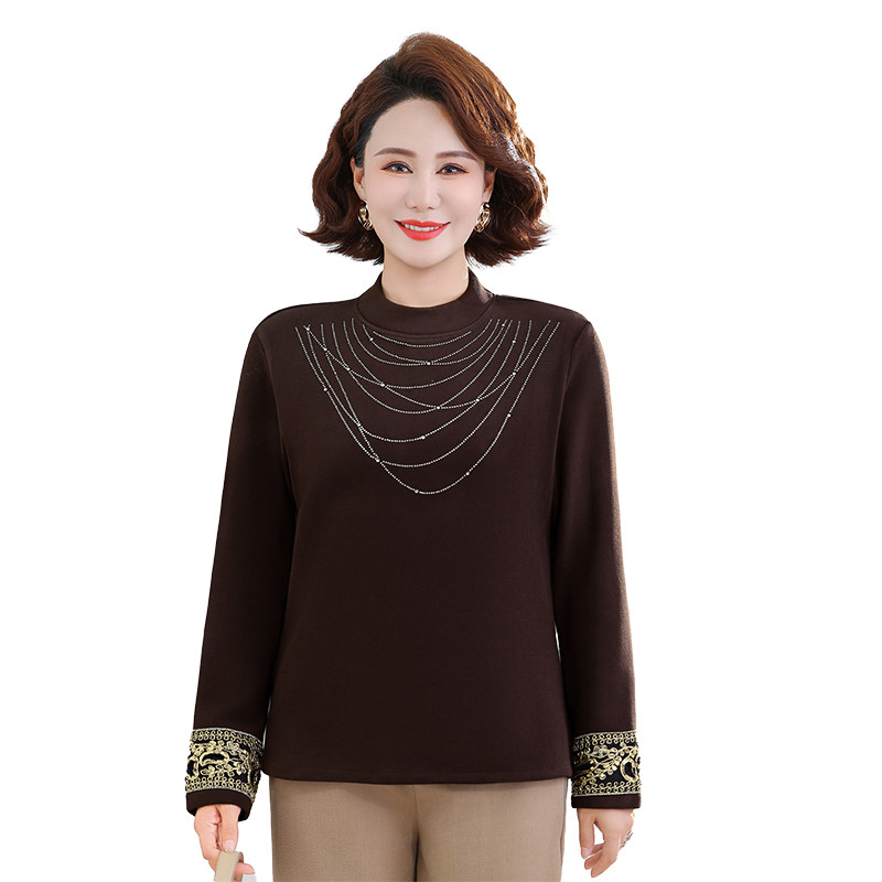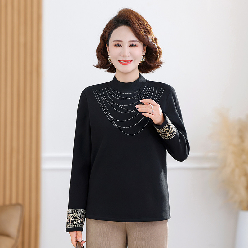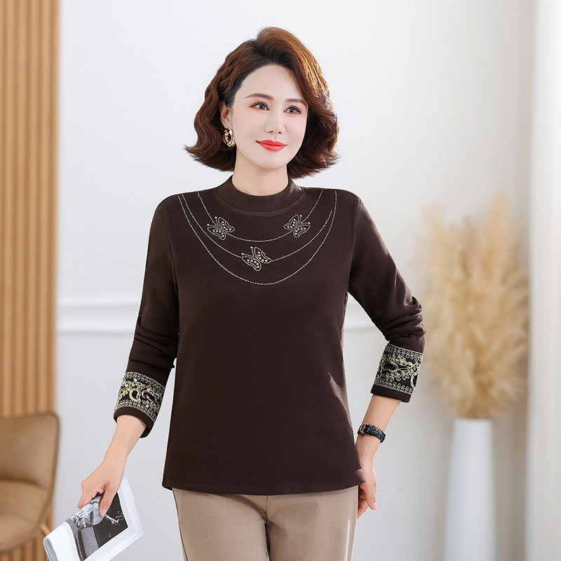 中年女士冬装烫钻加绒保暖上衣洋气妈妈新款加厚内搭打底衫可外穿
