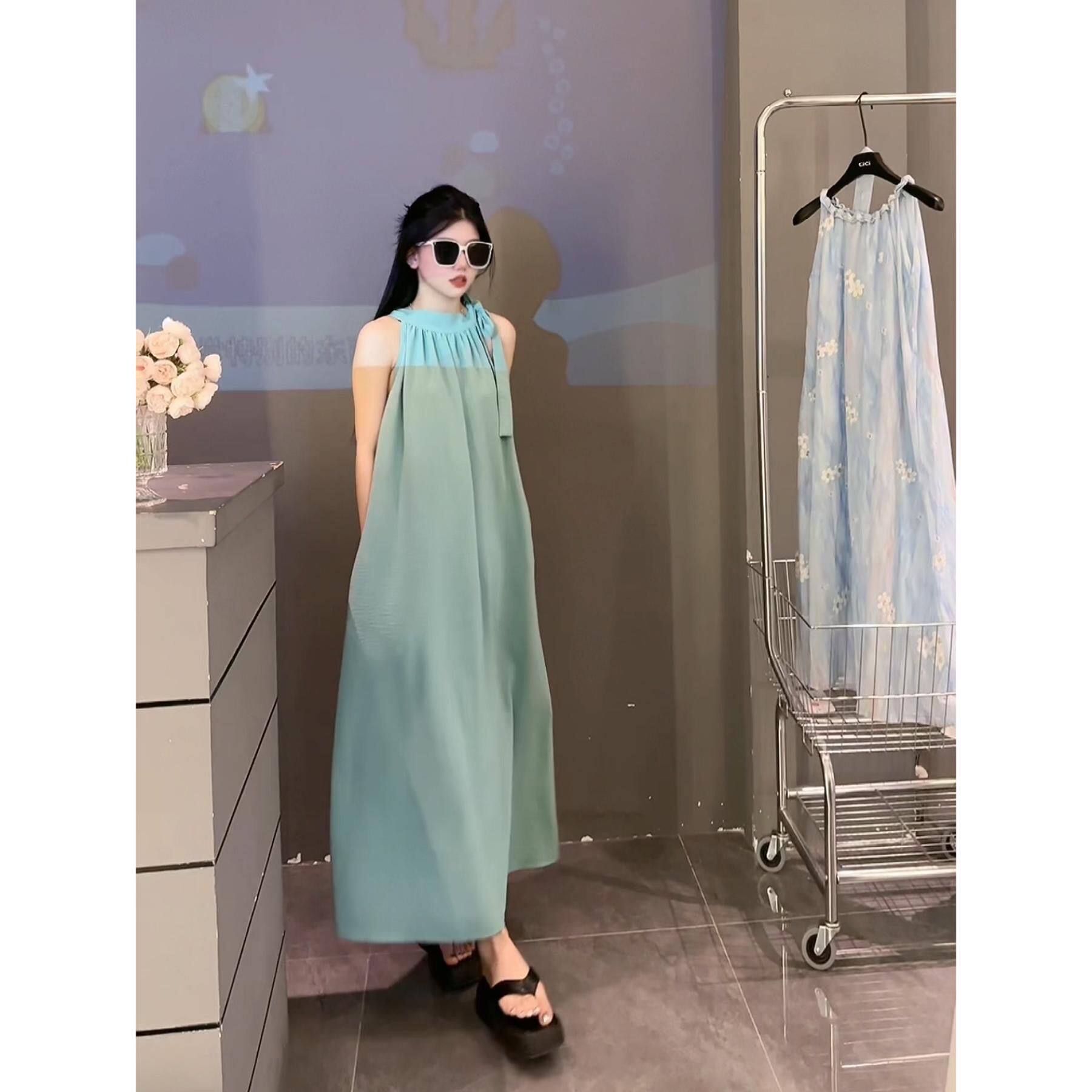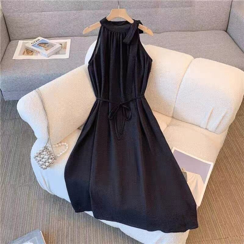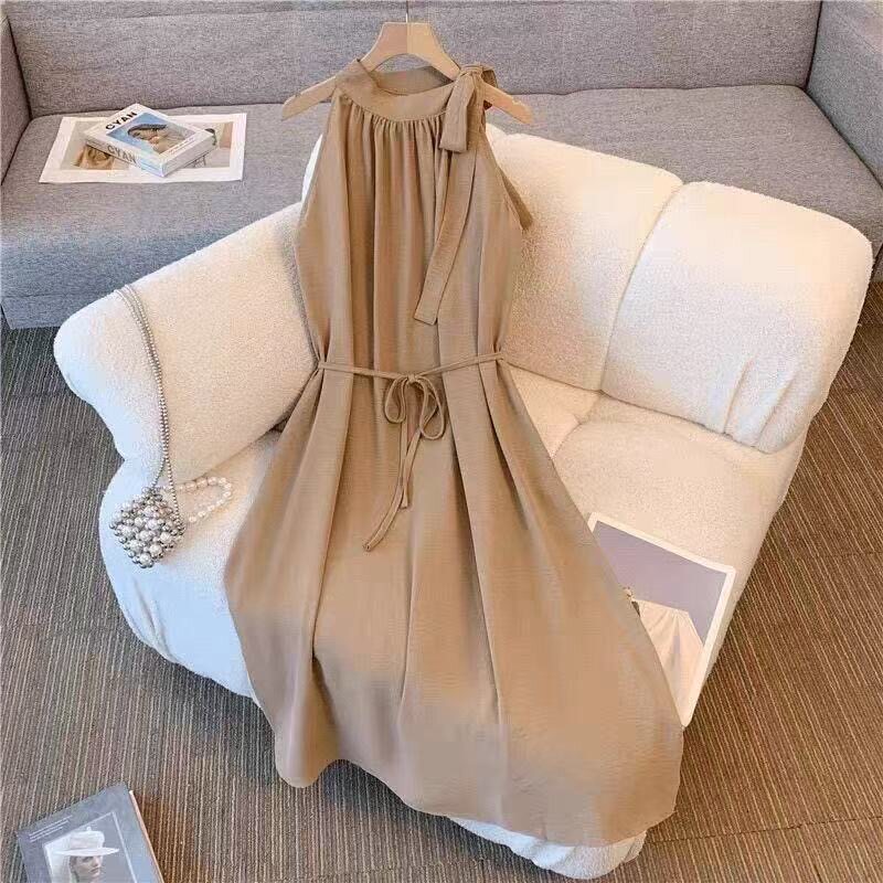 法式夏季名媛挂脖连衣裙露肩绑带宽松显瘦度假风无袖垂感气质裙子