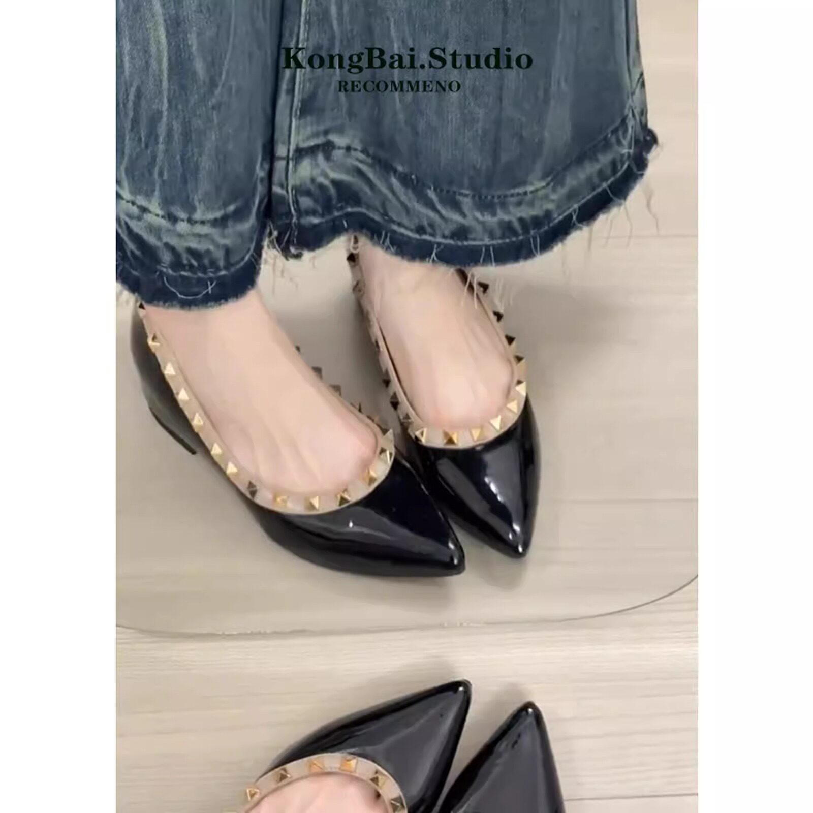 尖头铆钉女鞋子2026新款夏季配裙内增高5cm裸色法式浅口平底单鞋