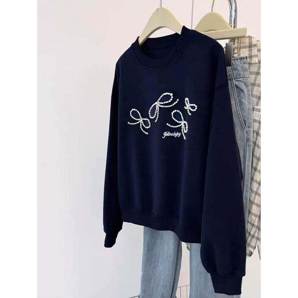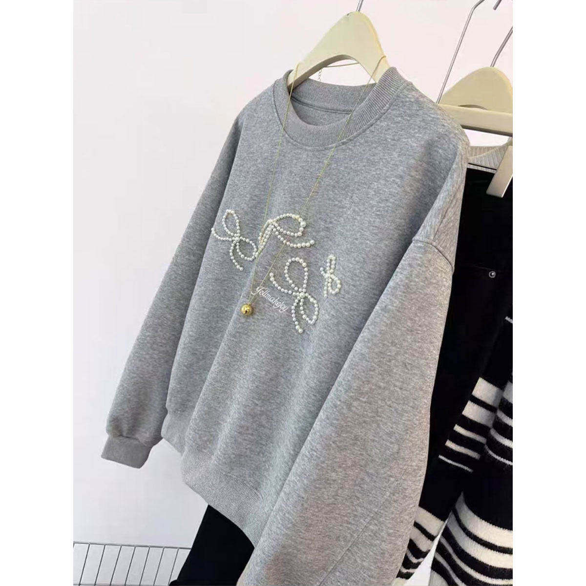 新品美式宽松慵懒风小个子钉珠卫衣女款2026春季胖mm大码圆领上衣