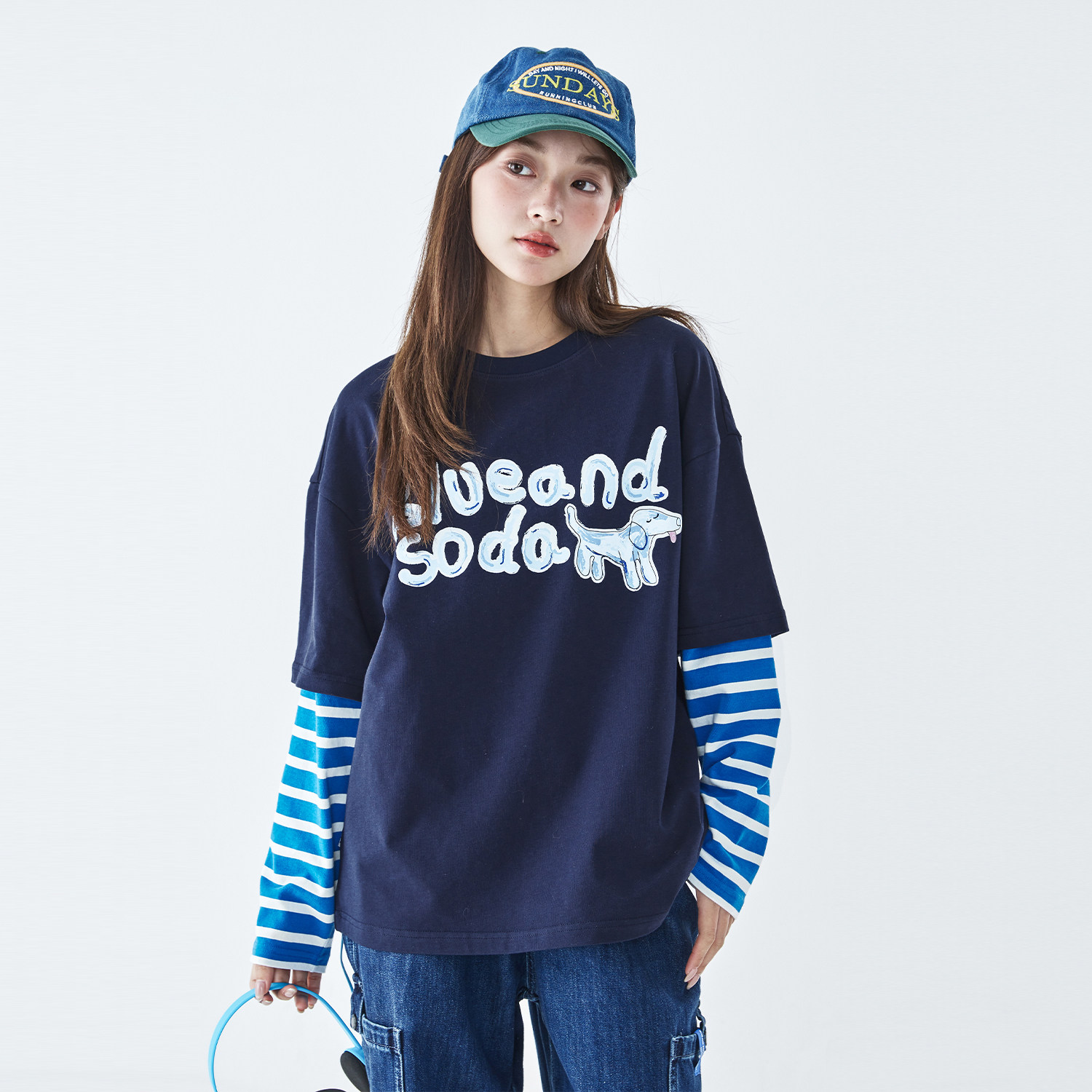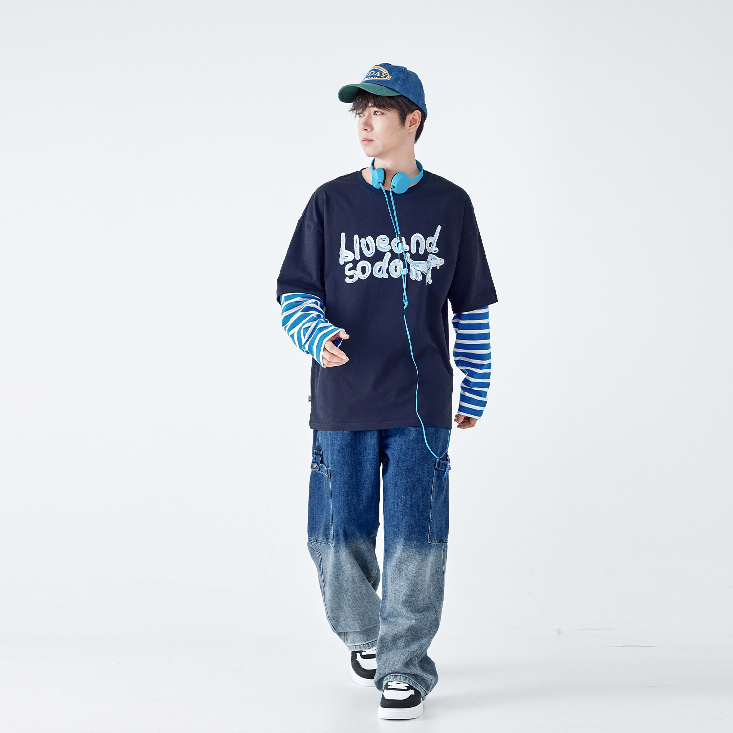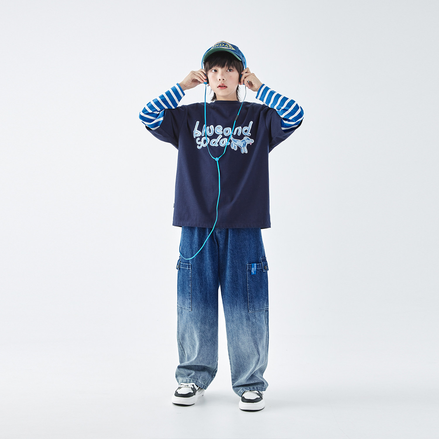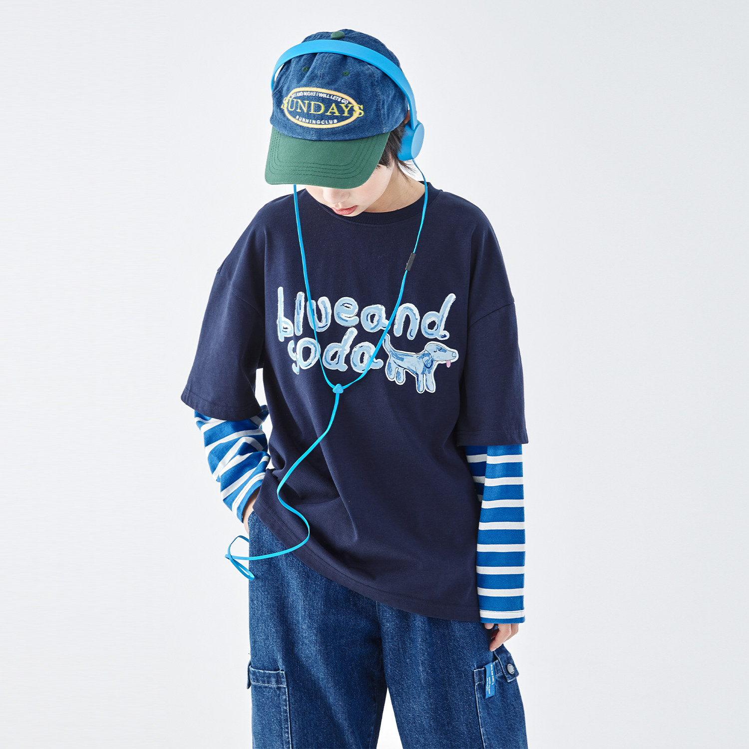 蓝汽水2026春季新款男童T恤潮酷字母青少年假两件全棉长袖上衣