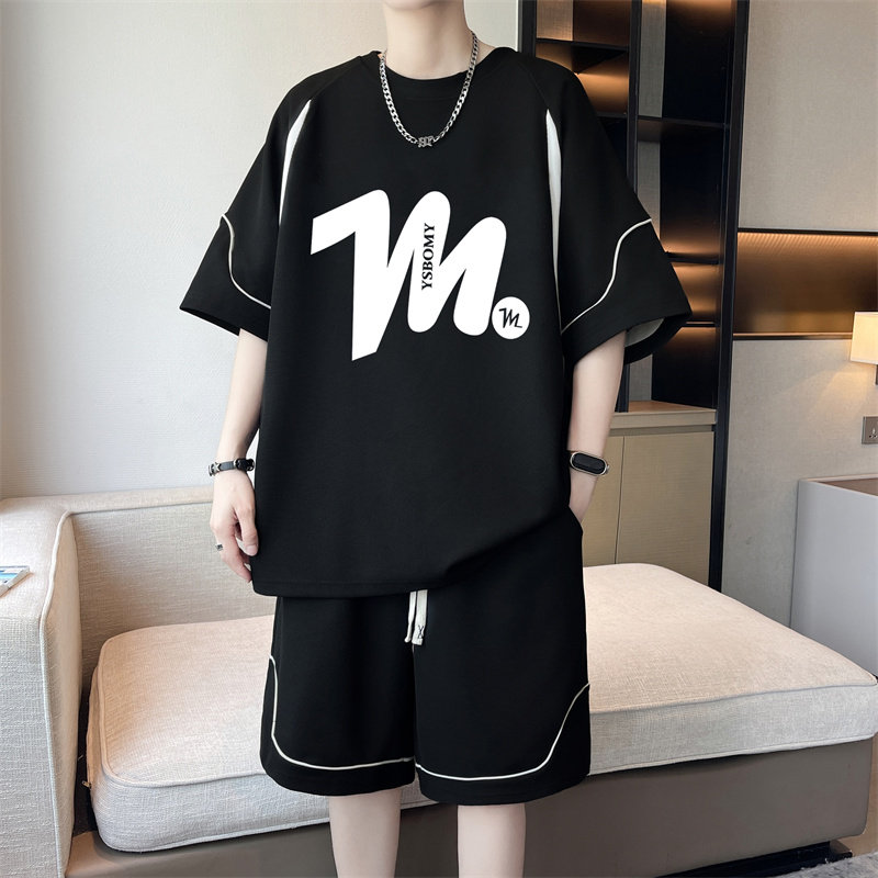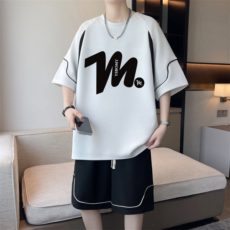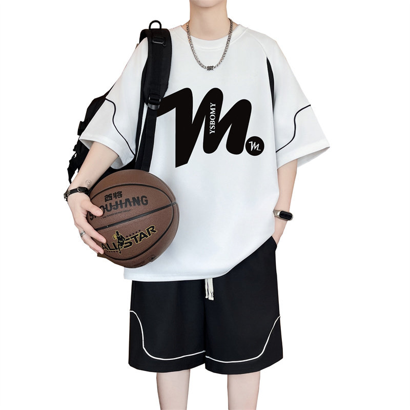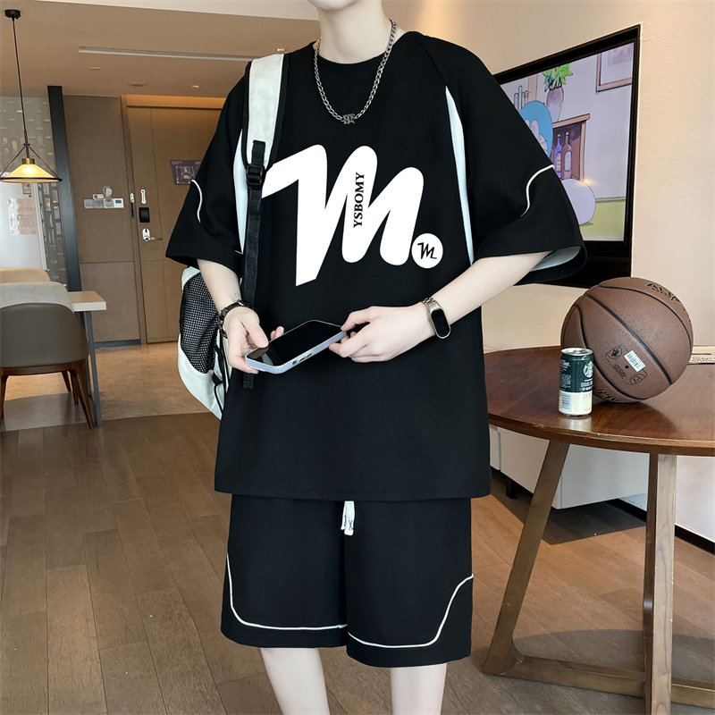 夏季新款冰丝短袖t恤男孩初中学生宽松青少年大童休闲运动套装潮