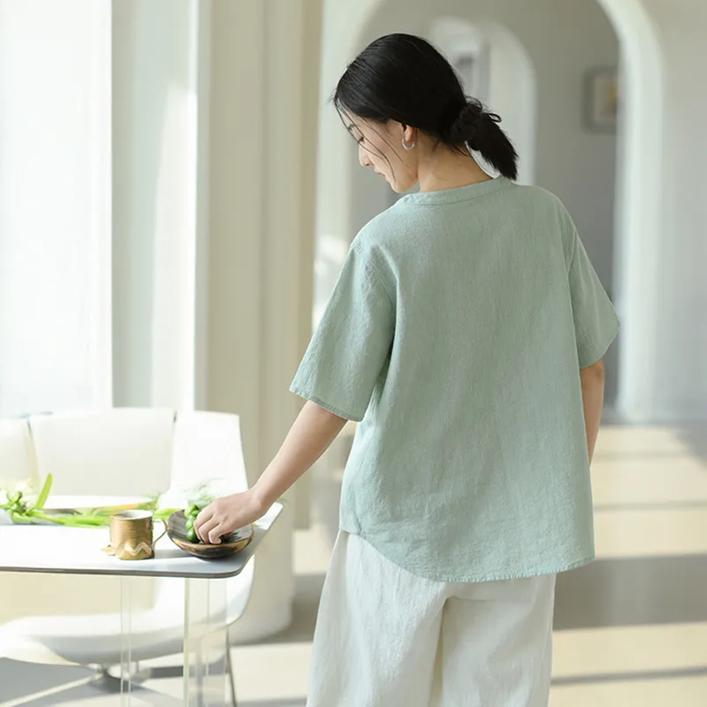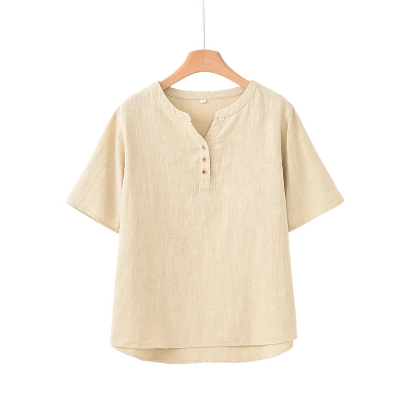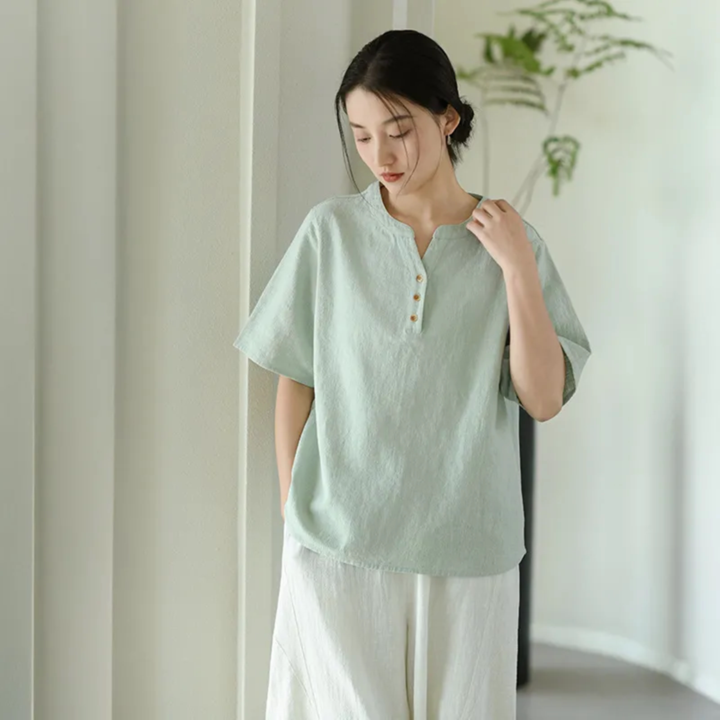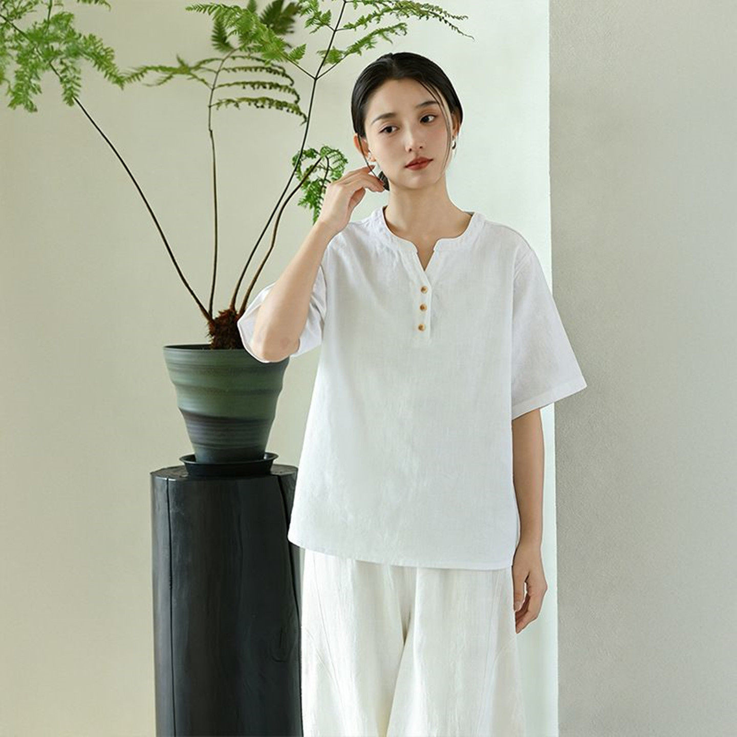 2026夏季新款棉麻女装高端苎麻v领短袖套头T恤女宽松透气通勤衬衫