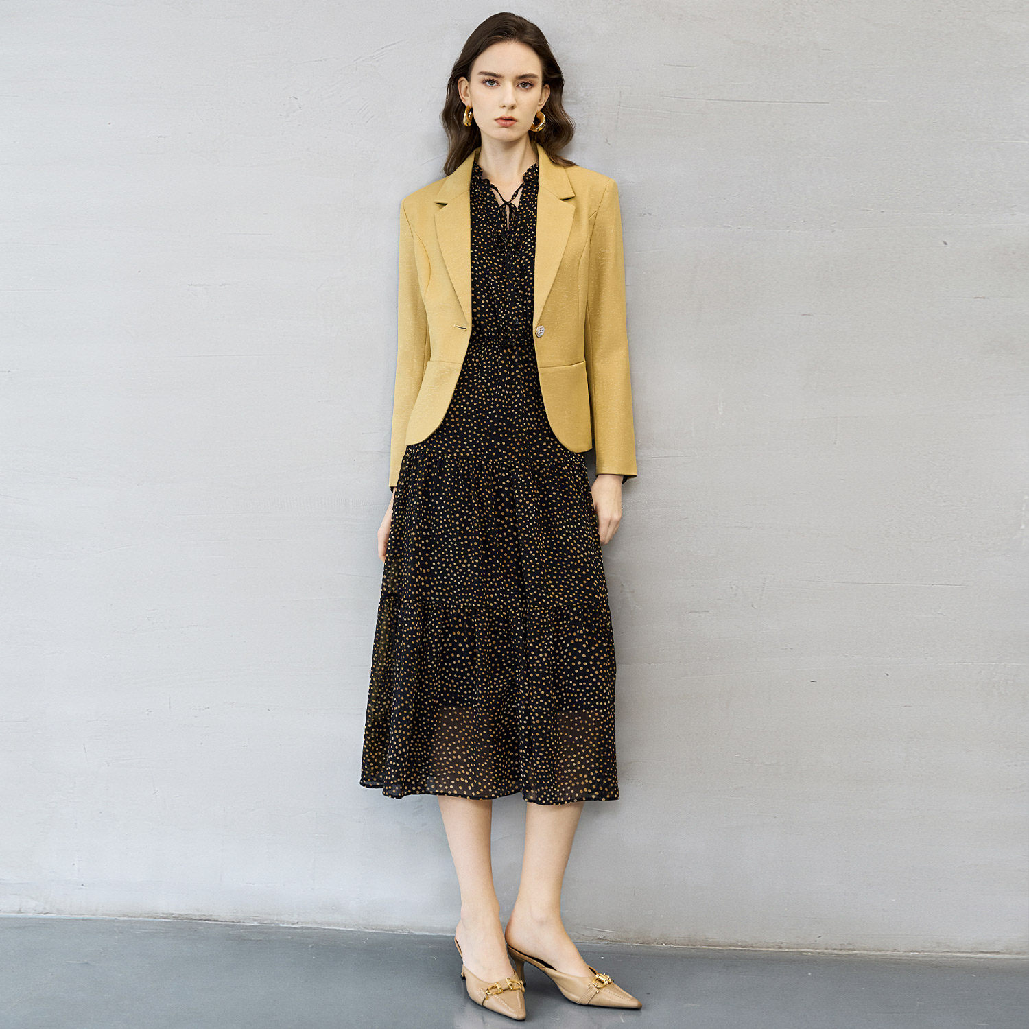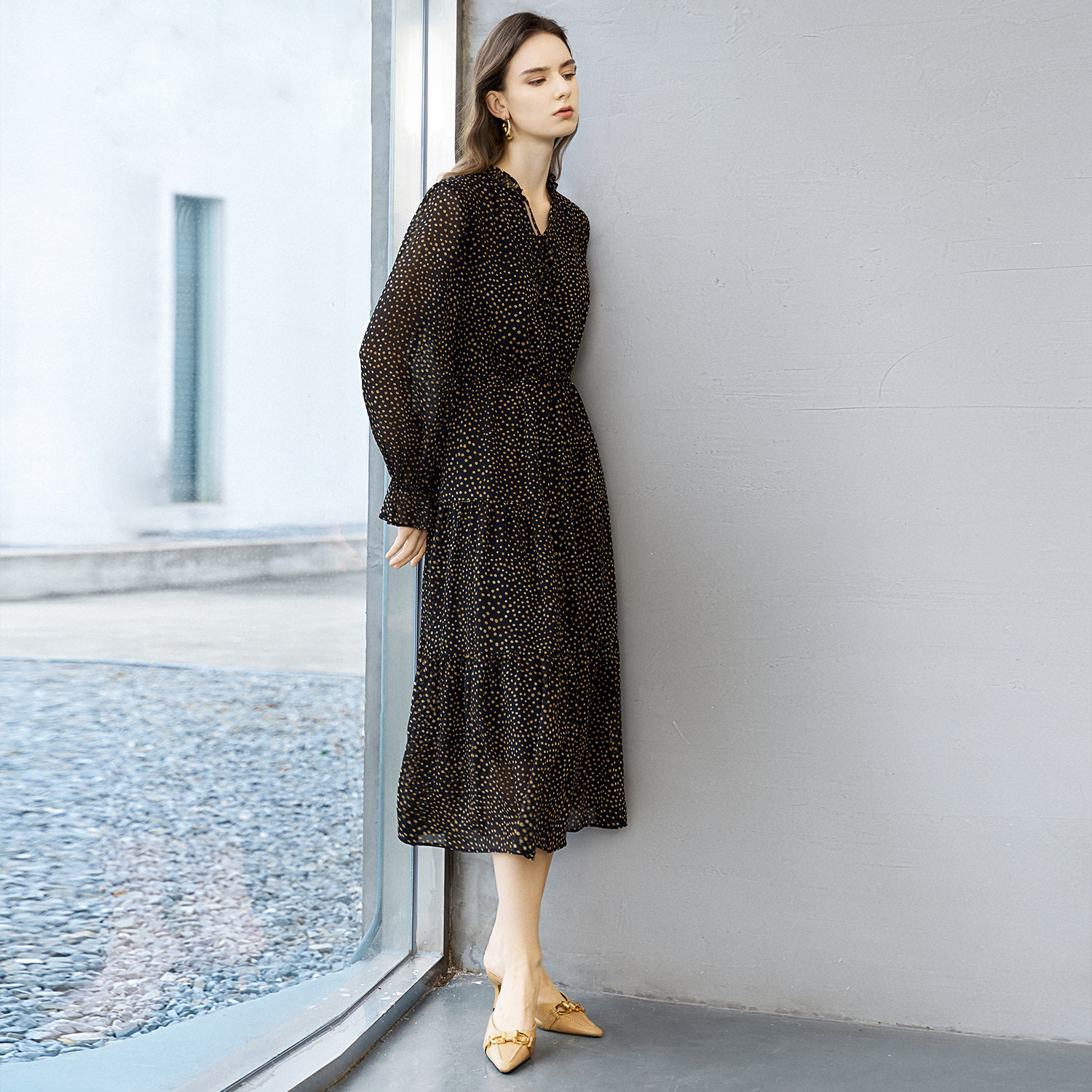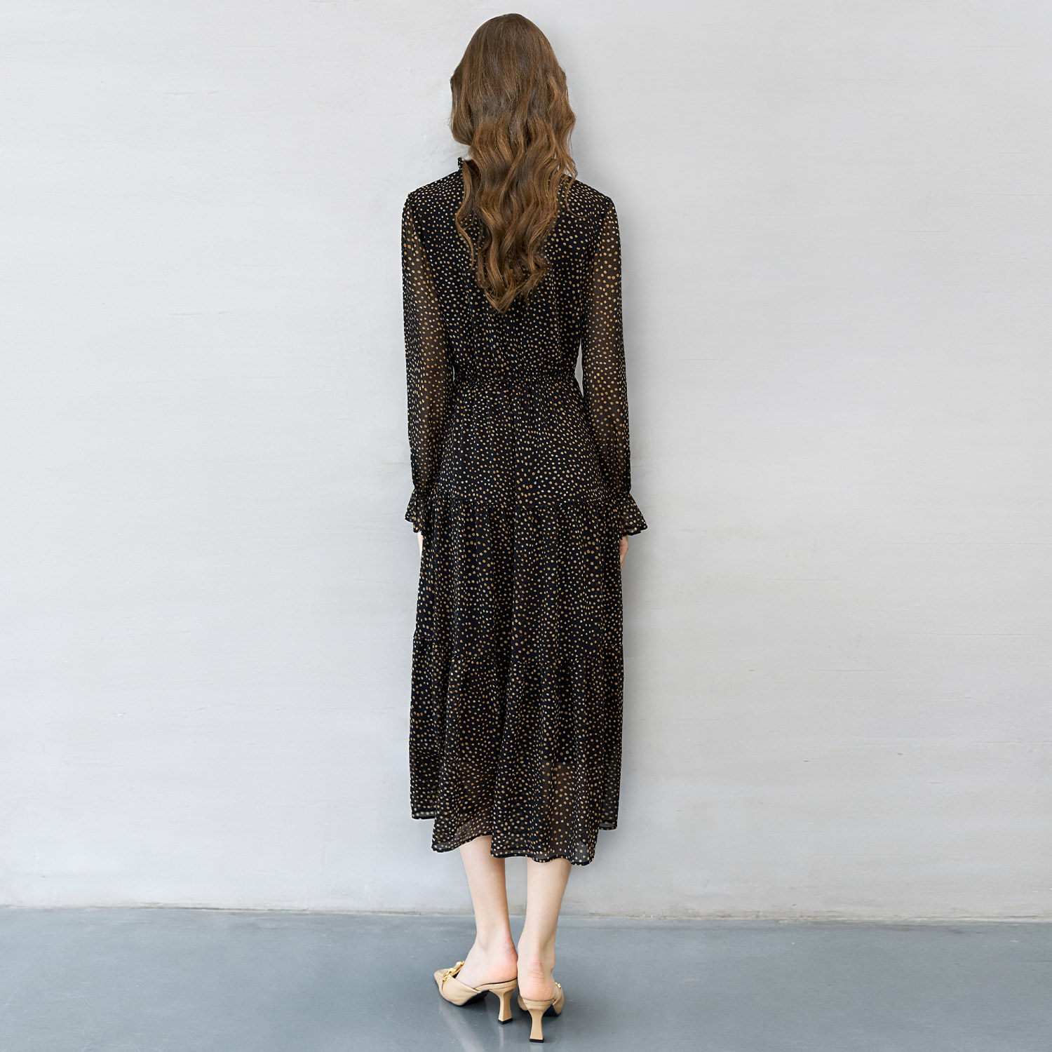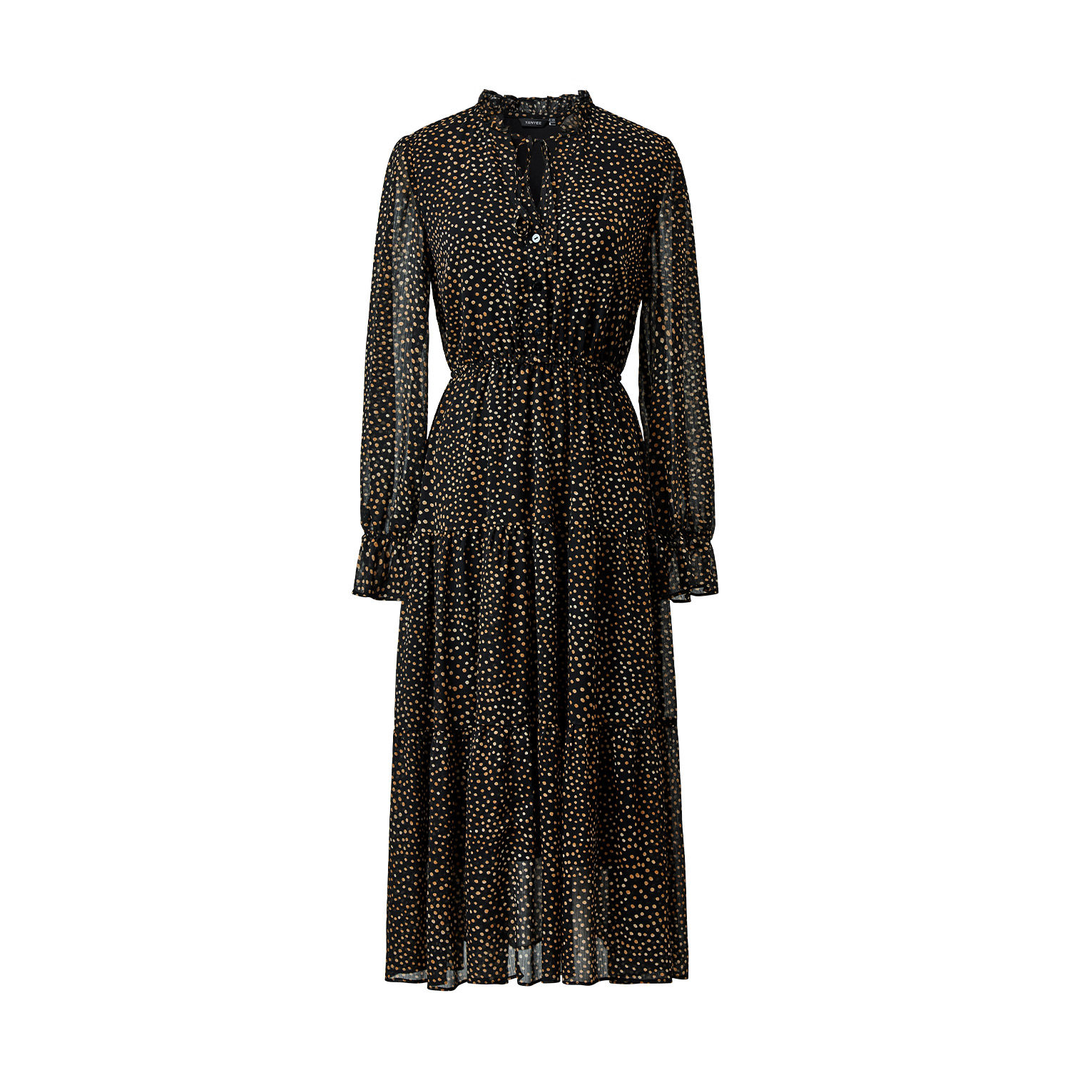 颜域黑色波点连衣裙女装2026早春新款喇叭袖收腰显瘦通勤轻熟长裙