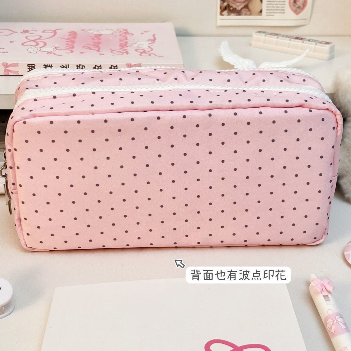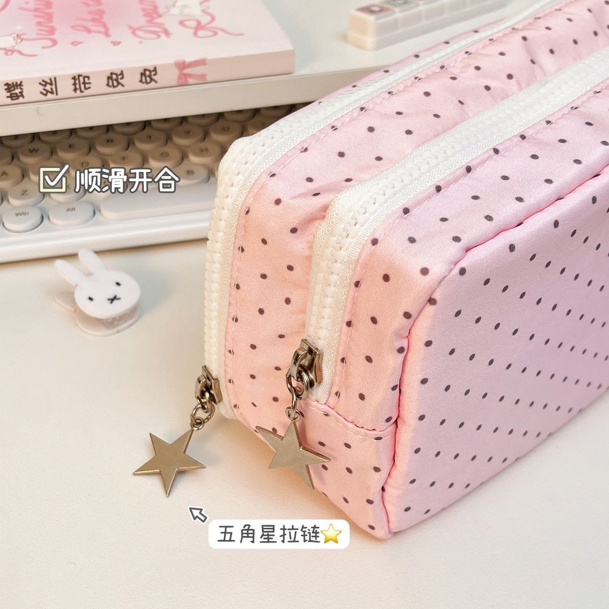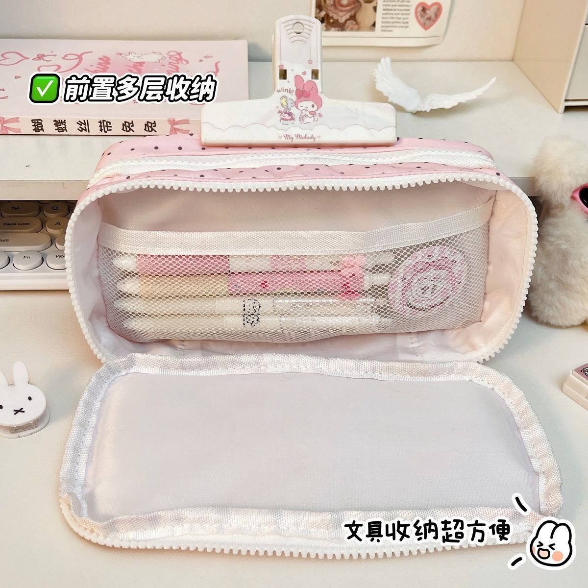 粉色波点兔子双层笔袋双层大容量可爱学生文具盒高颜值不撞款小清新女生收纳包初中生学习用品专用考试笔袋