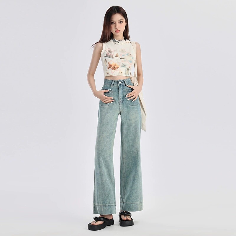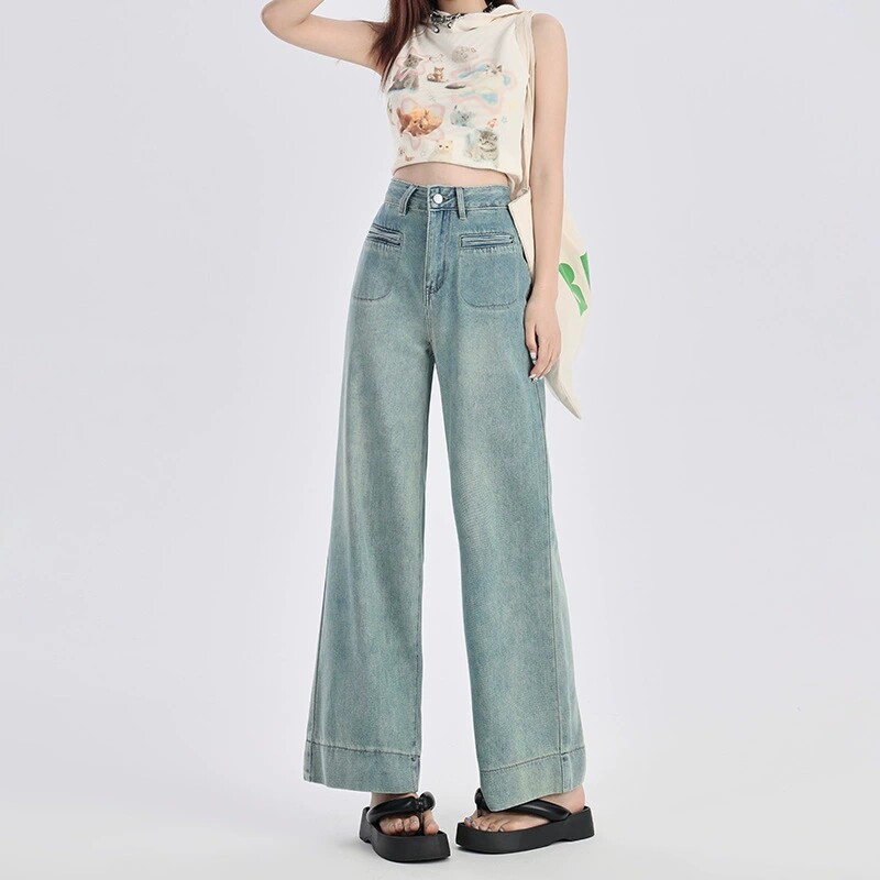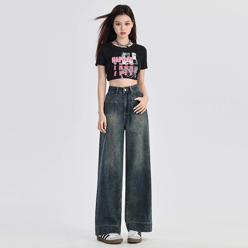 美式阔腿牛仔裤女春夏季2026年新款高腰宽松显瘦小个子九分直筒裤