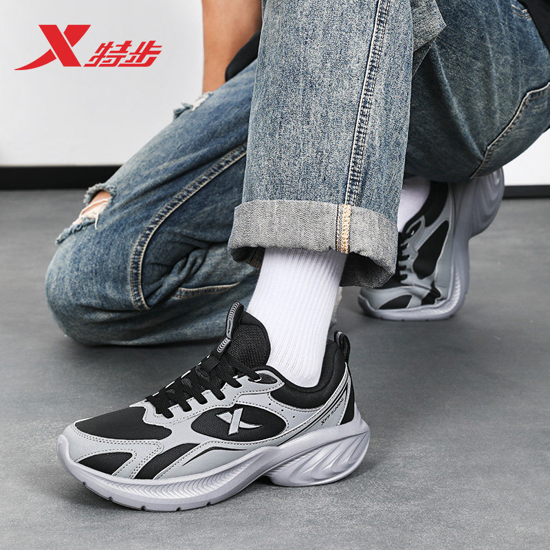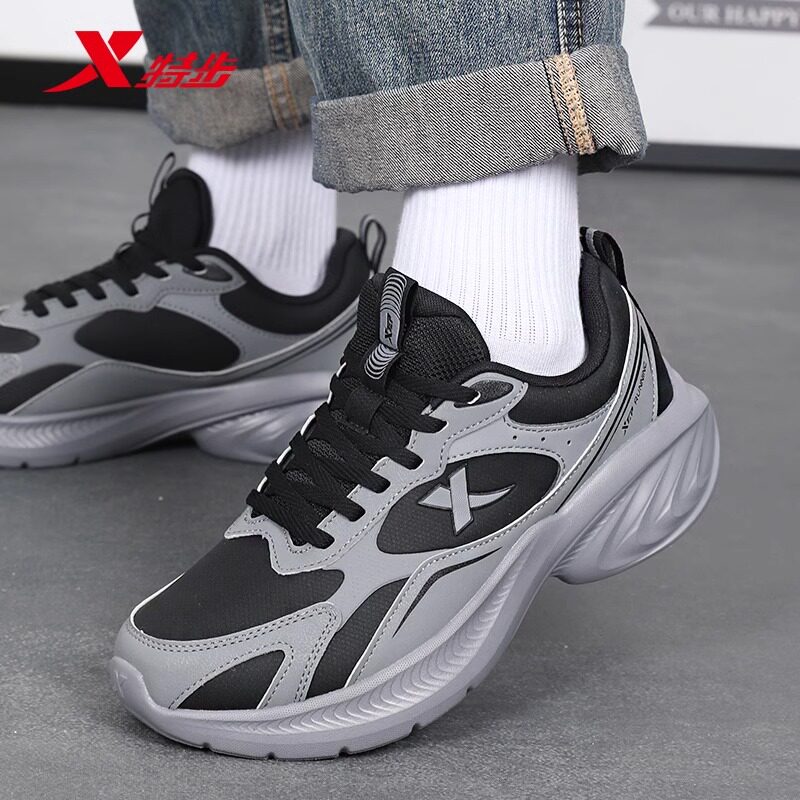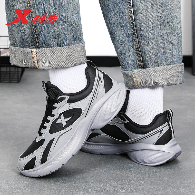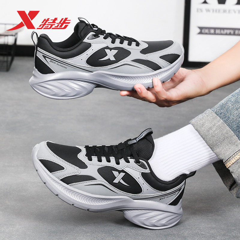 特步男鞋跑步鞋男款春季新款黑色休闲鞋子减震皮面防水男士运动鞋