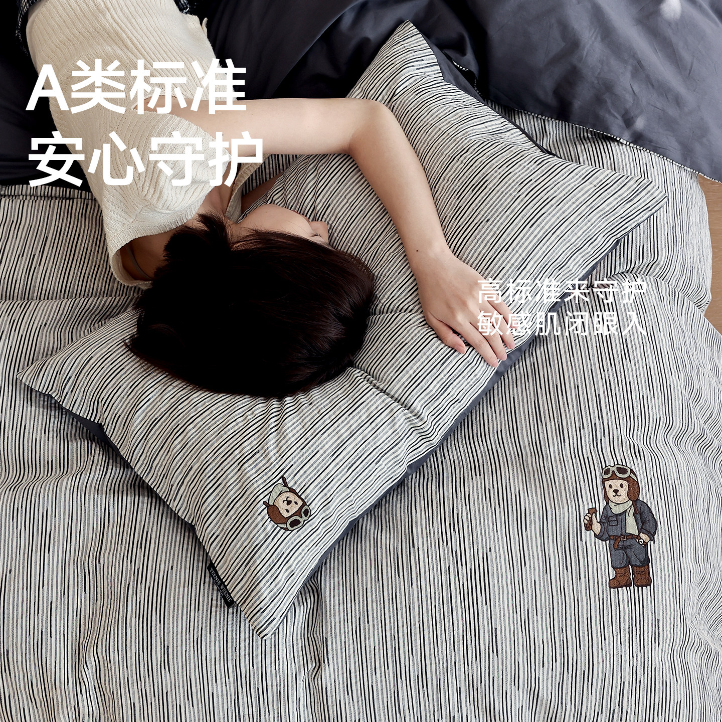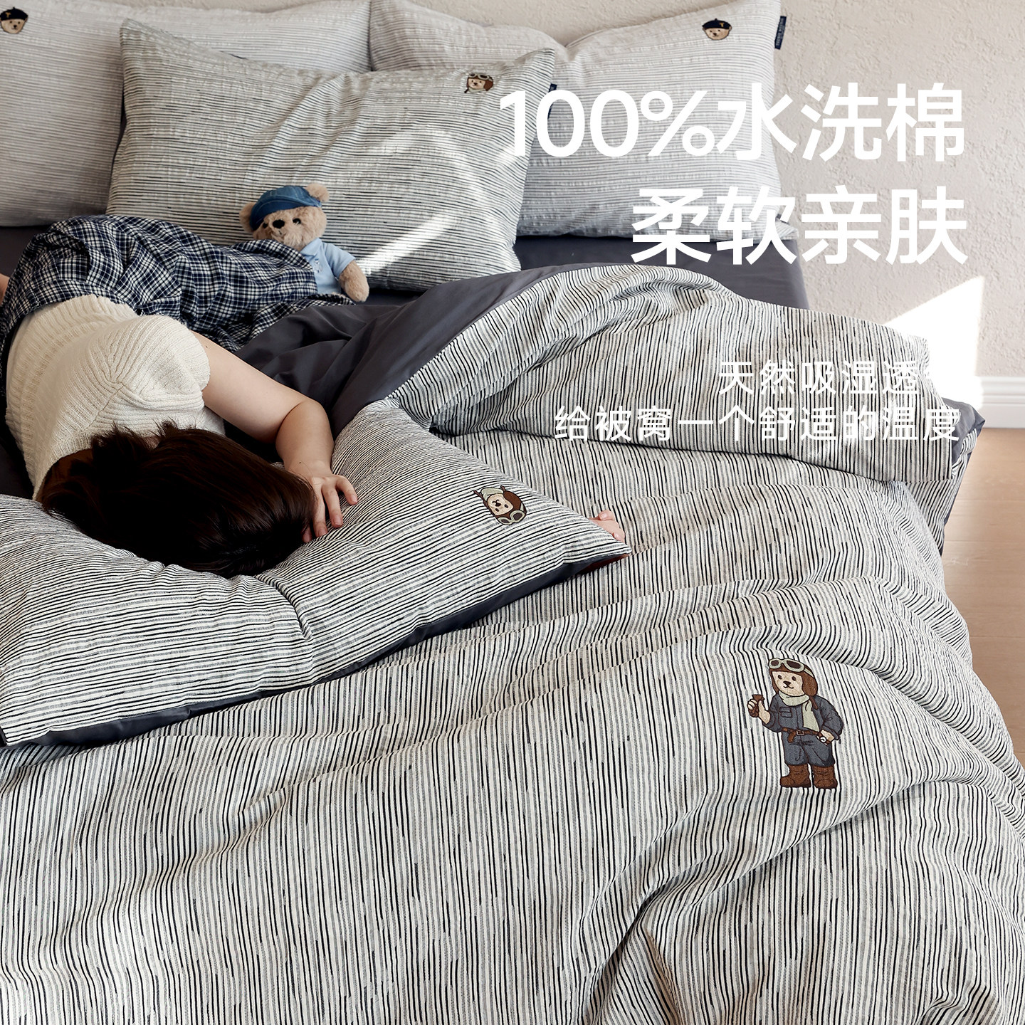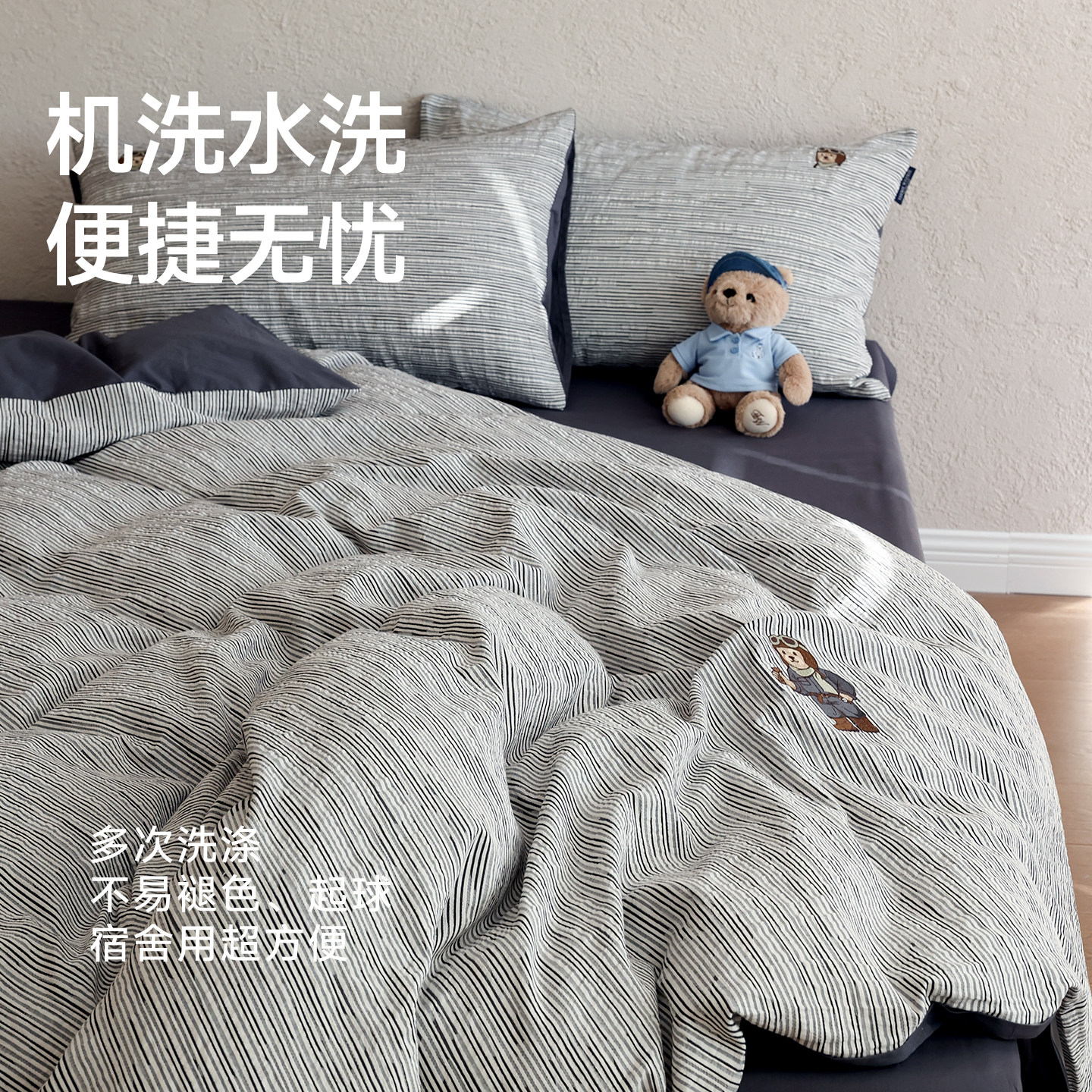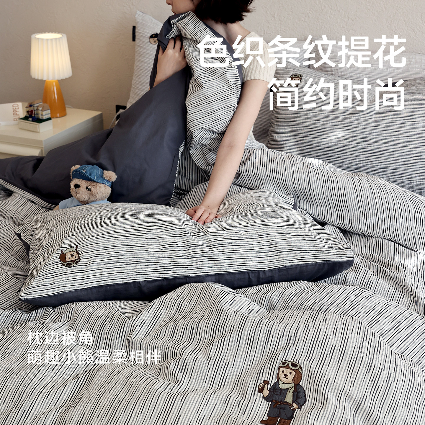 TW简约风全棉纯棉四件套2026黑白条纹男生轻奢床单被套宿舍三件套