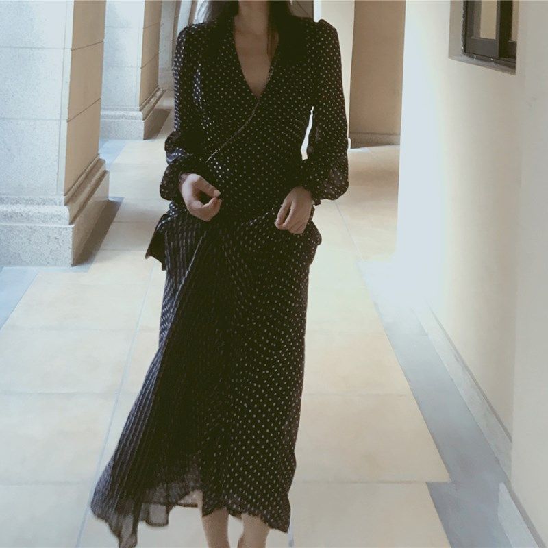 高个子连衣裙气质夏 超长款到脚踝内搭裙子 波点雪纺长袖v领长裙