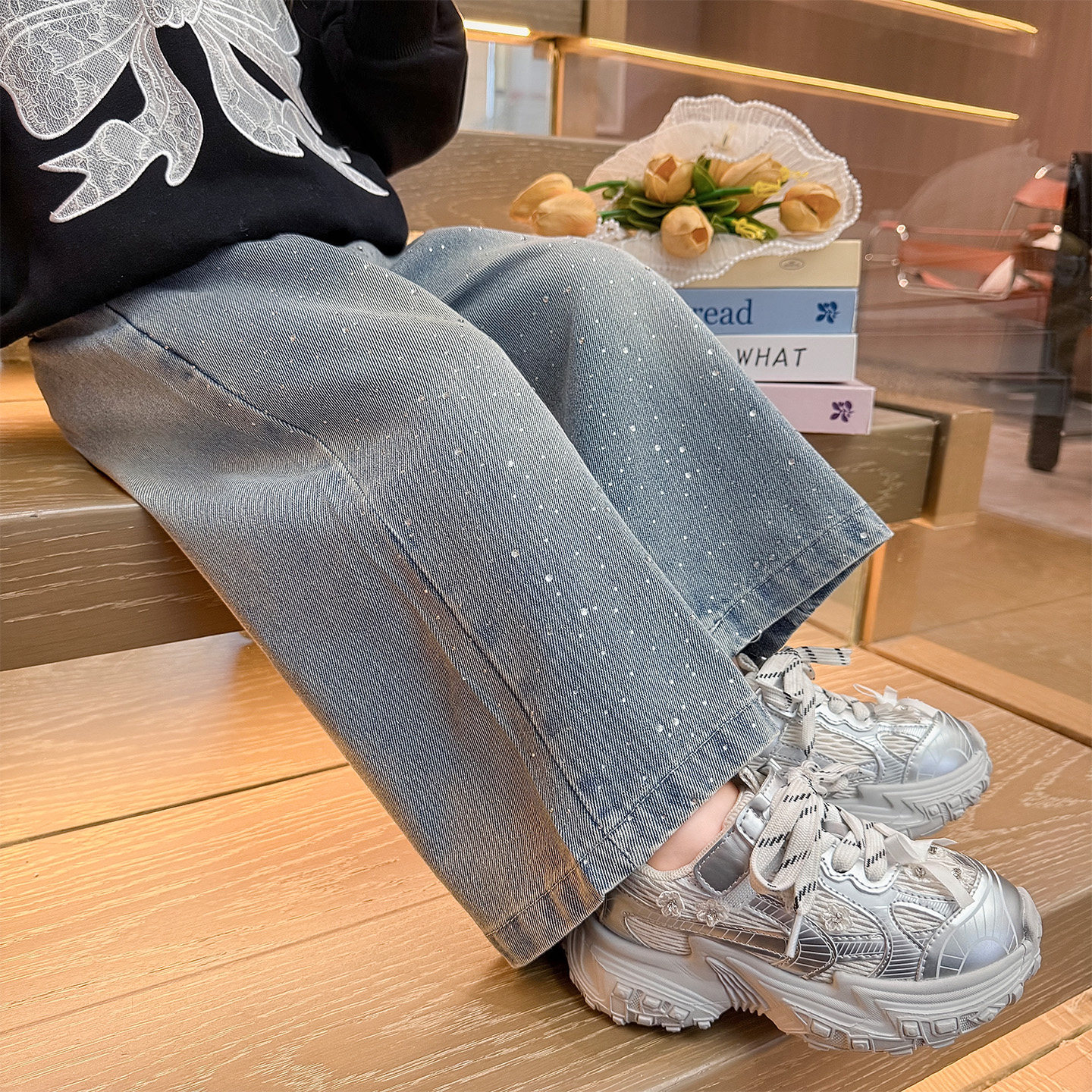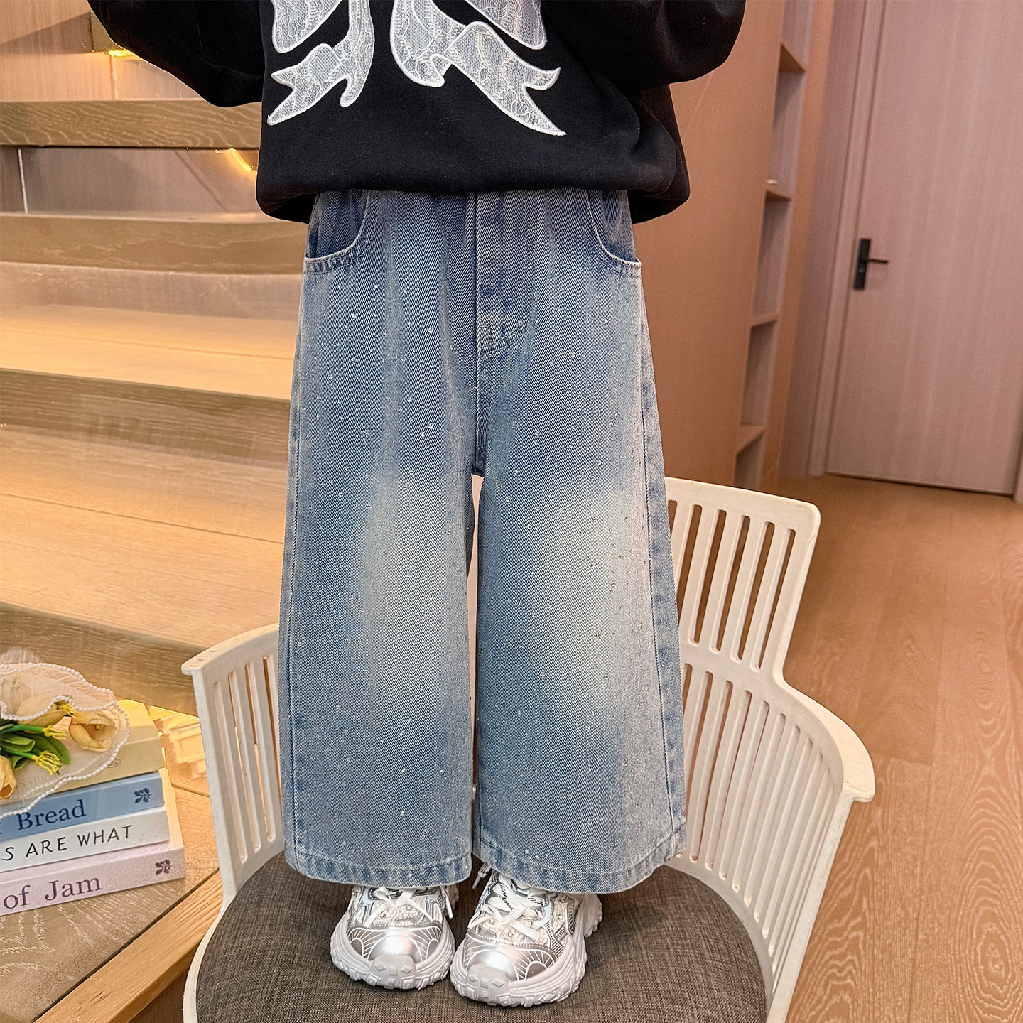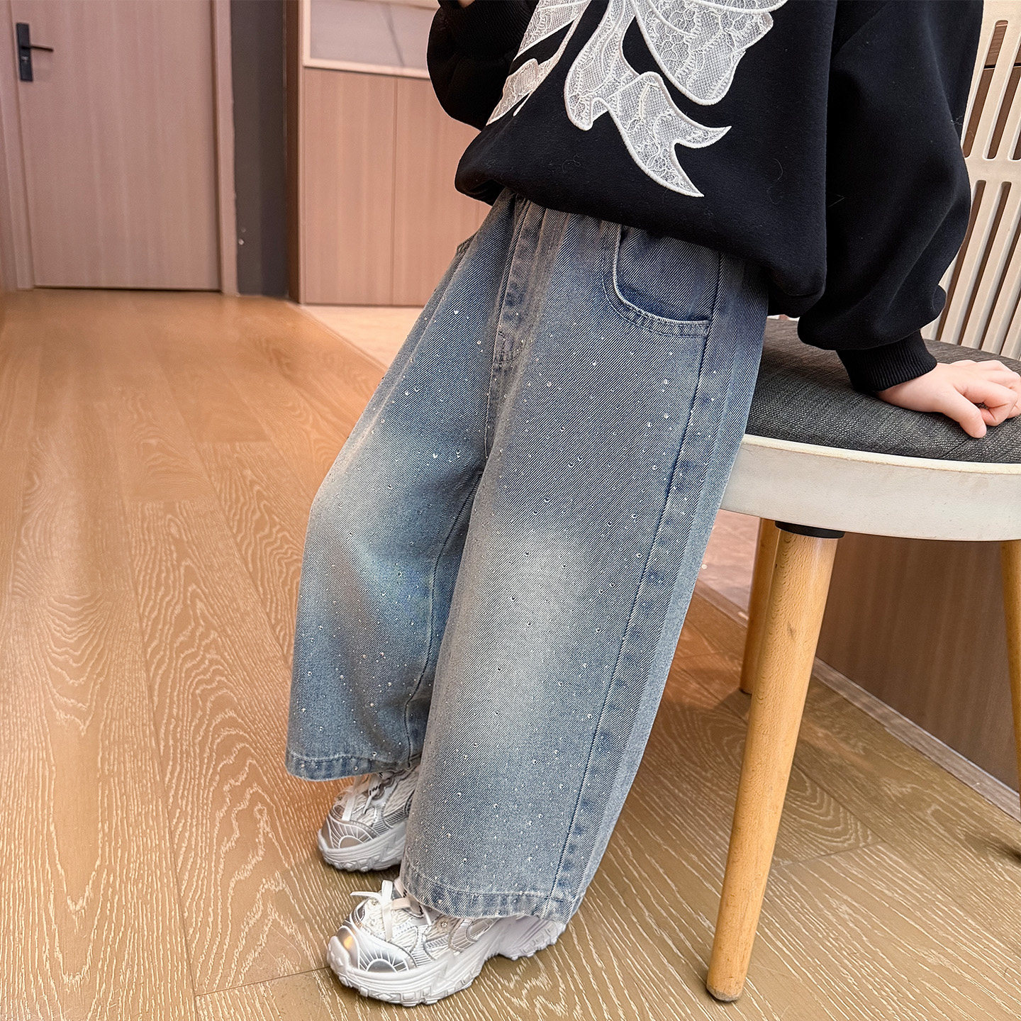 女童牛仔裤春秋款2026新款儿童春季女宝宝亮钻春装直筒裤阔腿裤子