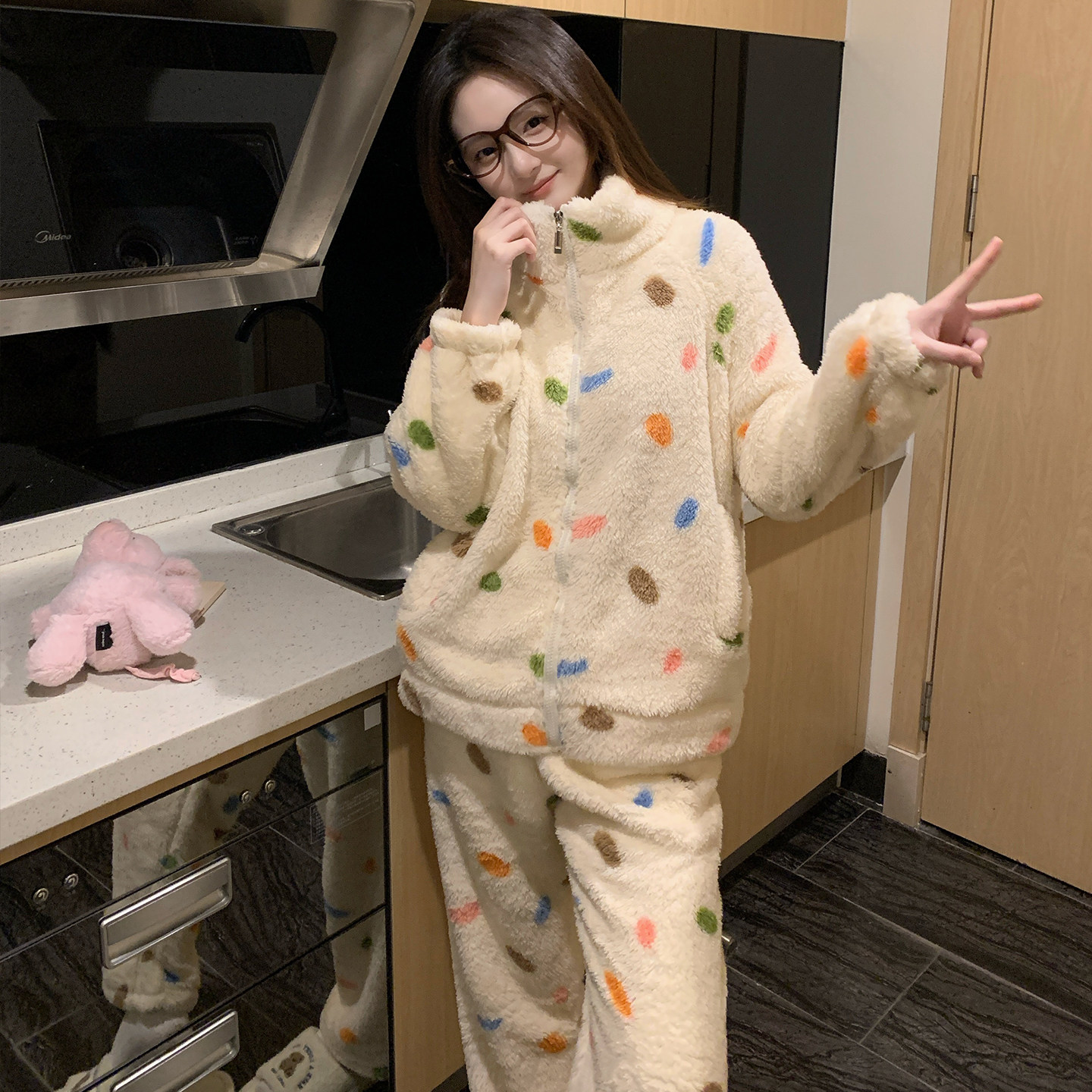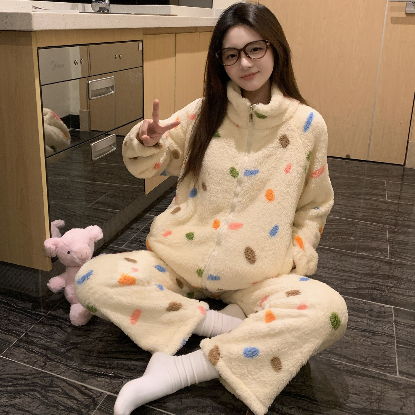 秋冬150cm小个子加厚珊瑚绒睡衣女套装宽松可外穿家居服两件套xs