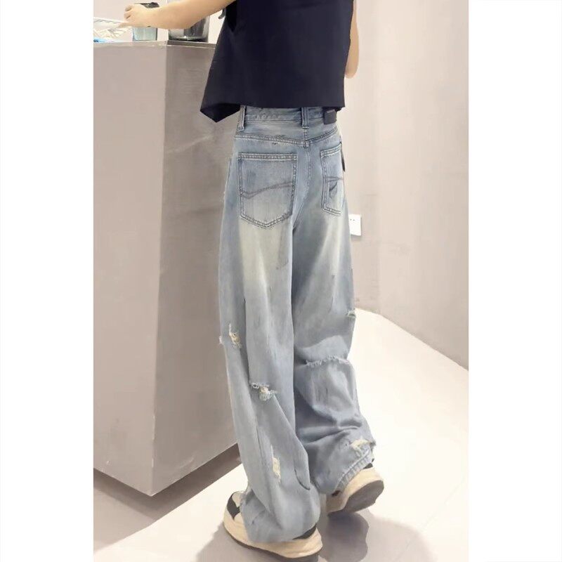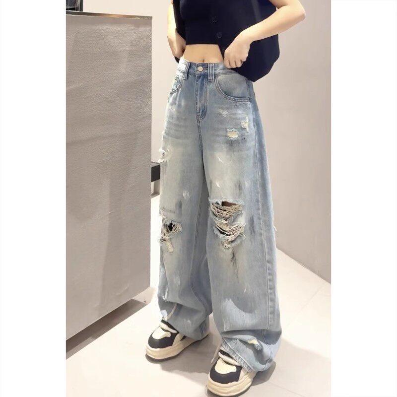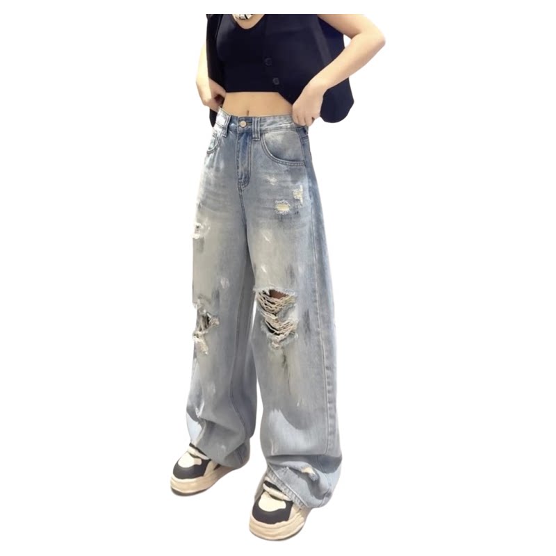破洞阔腿牛仔裤女2026春夏季新款直筒高腰宽松显瘦垂感弯刀长裤女
