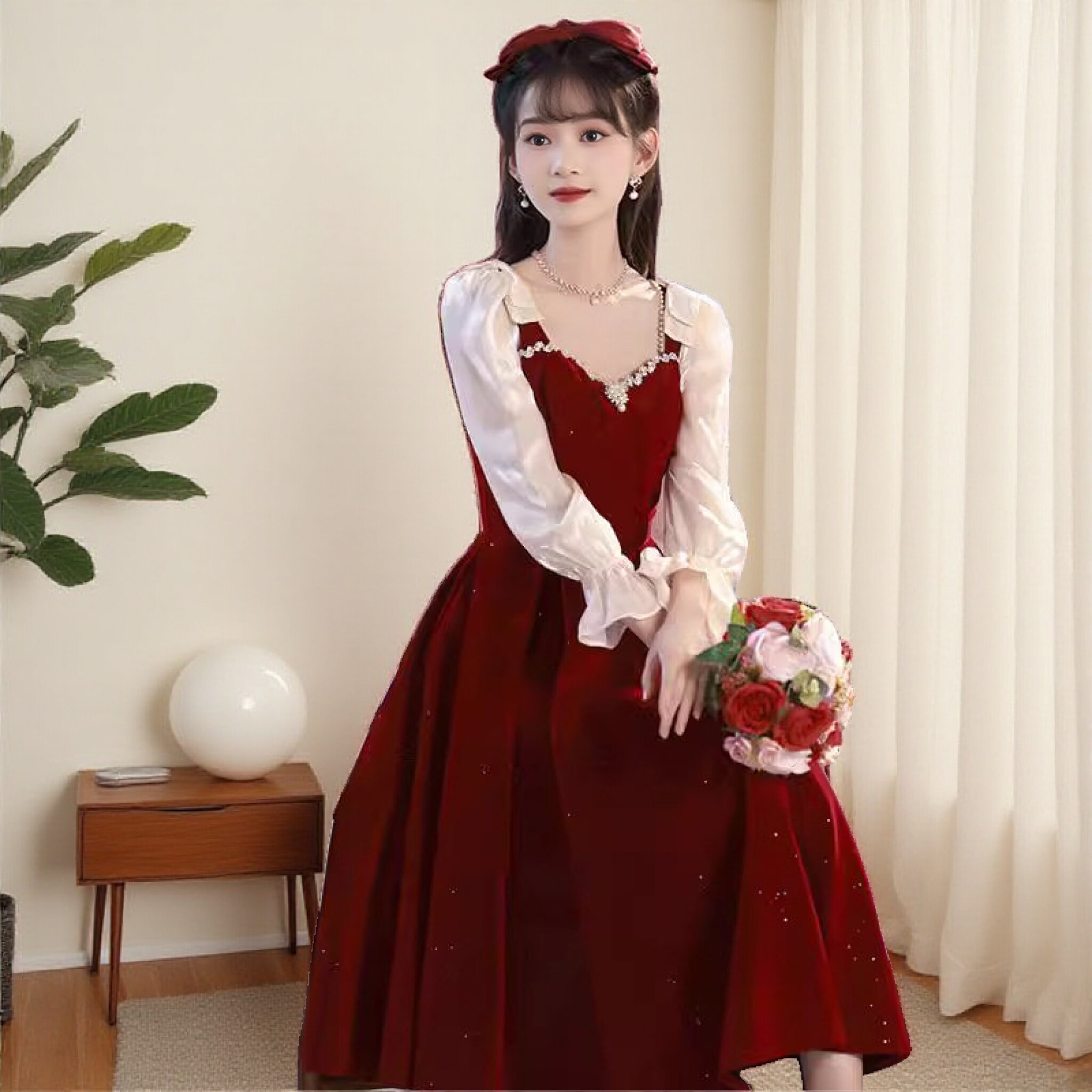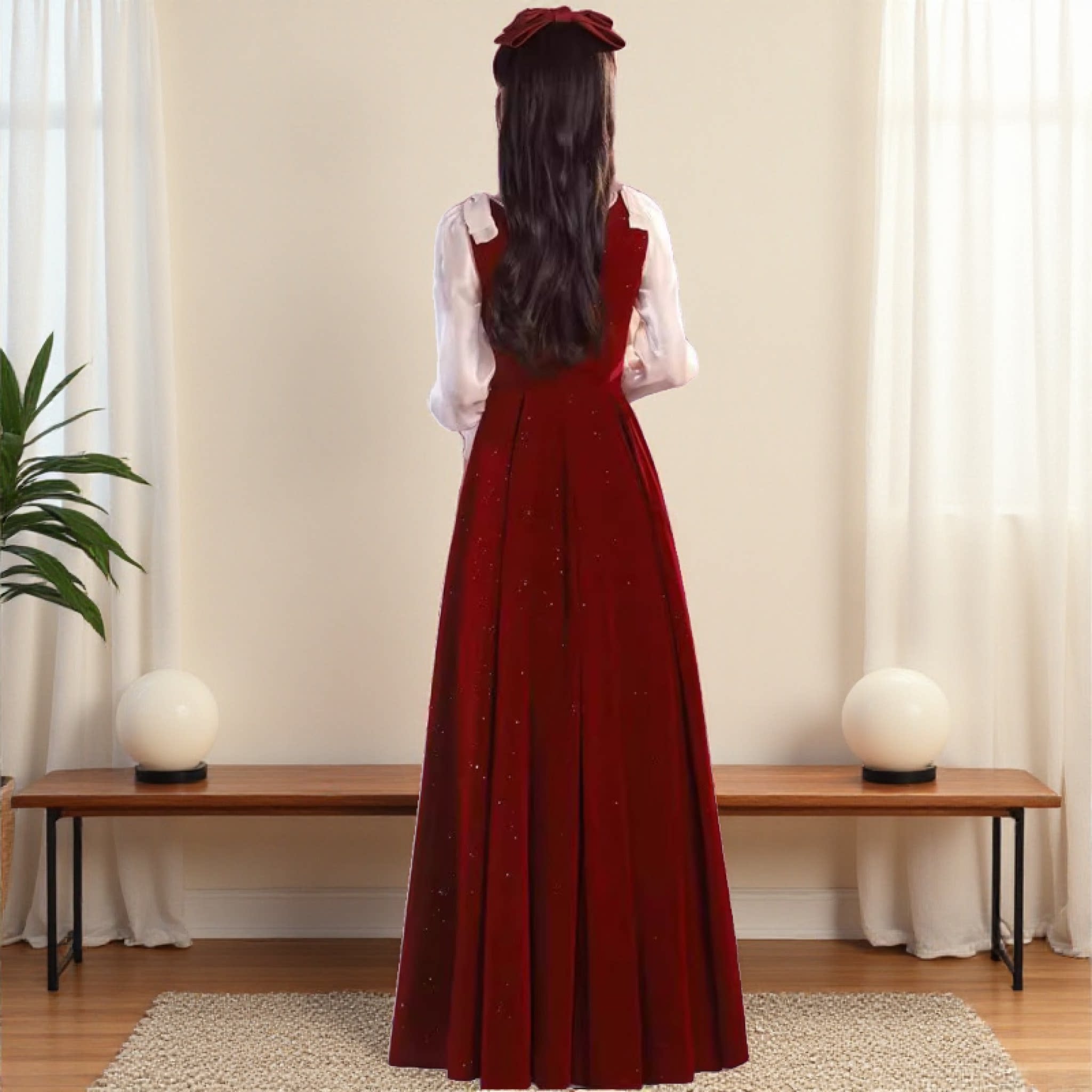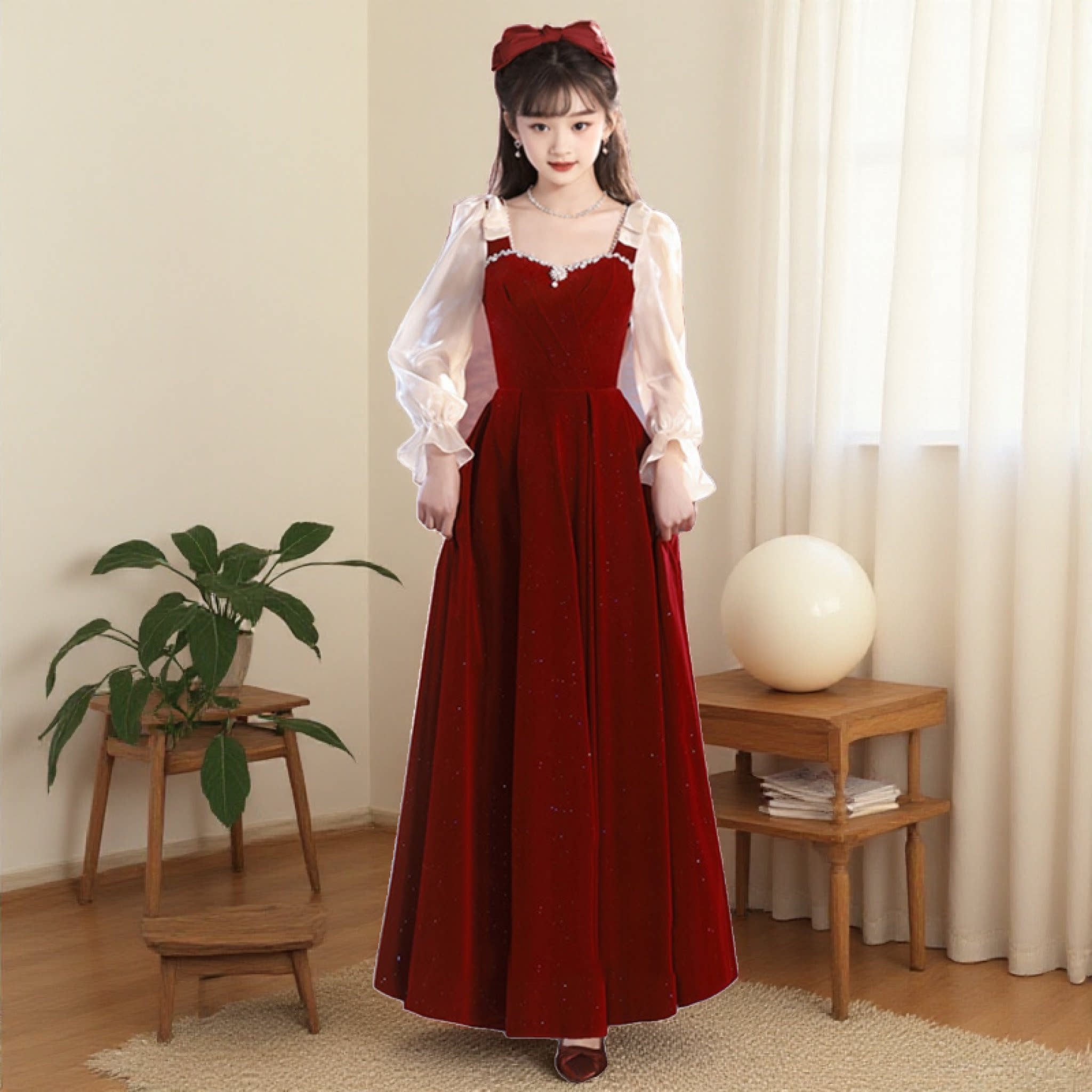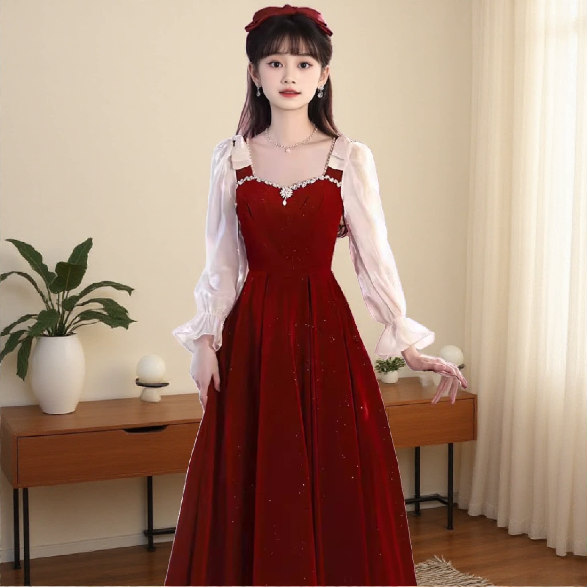 初中高中学生主持人礼服裙少女红色丝绒长袖指挥连衣裙18岁成人礼