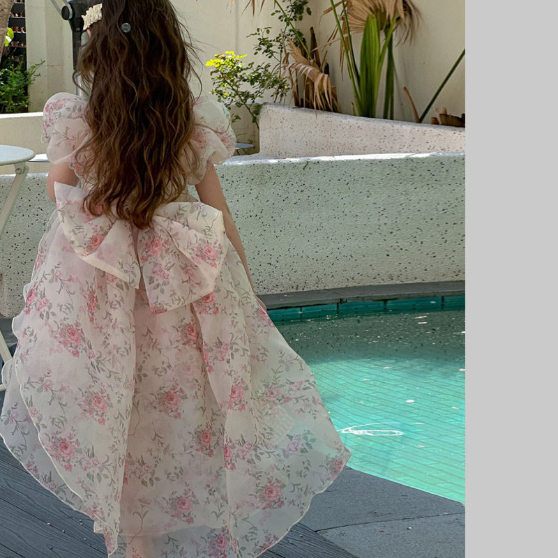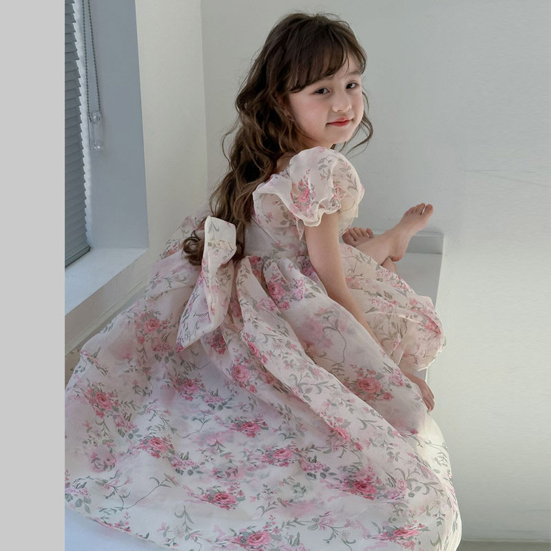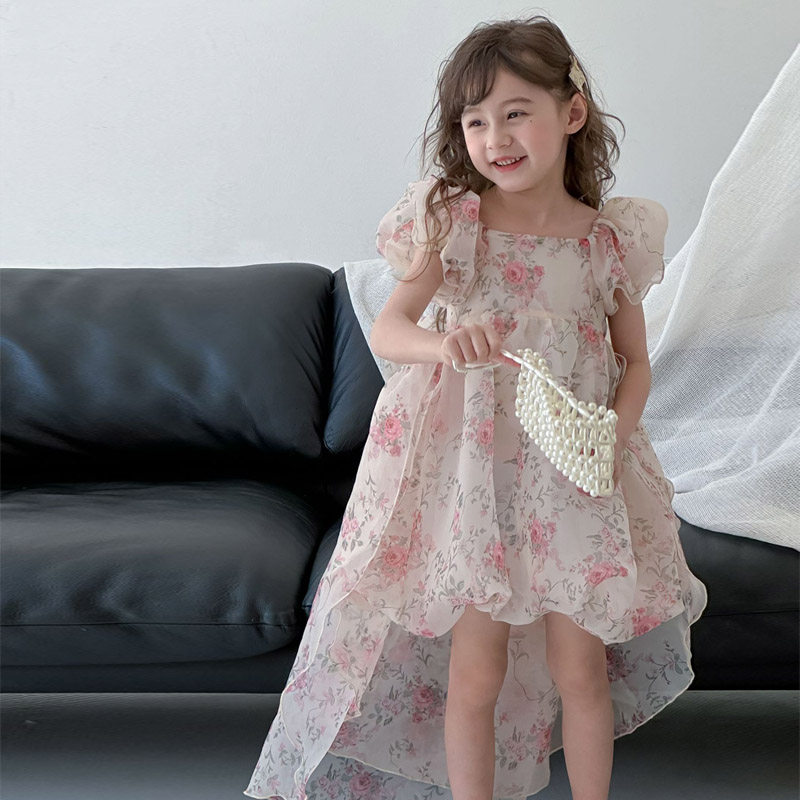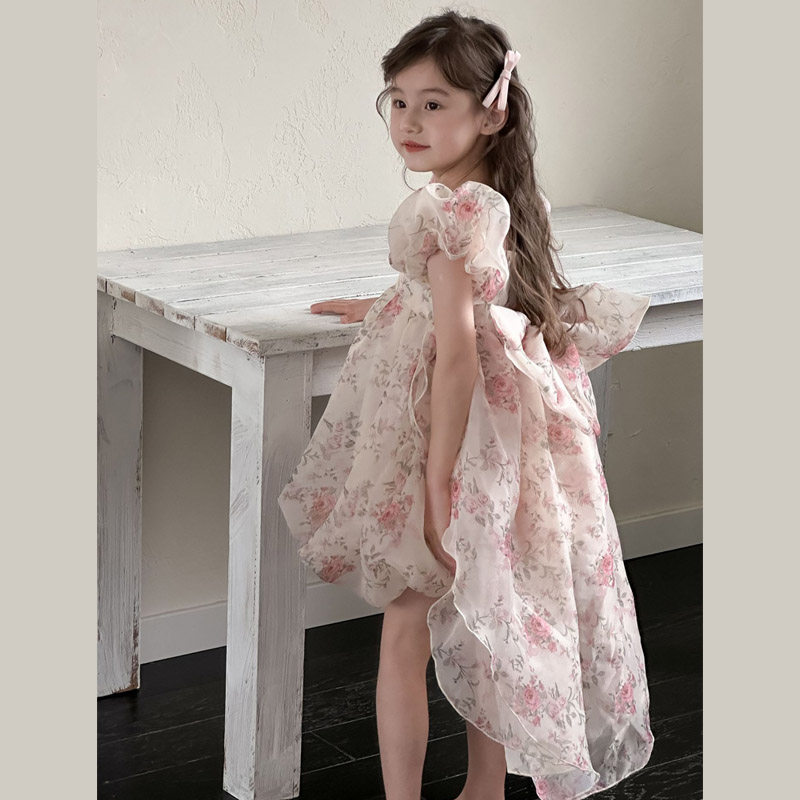 女童绝美拖尾公主裙高级感夏季2026新款儿童甜美粉色碎花连衣裙子