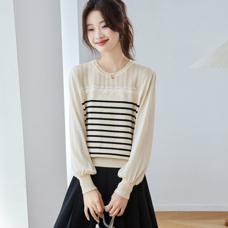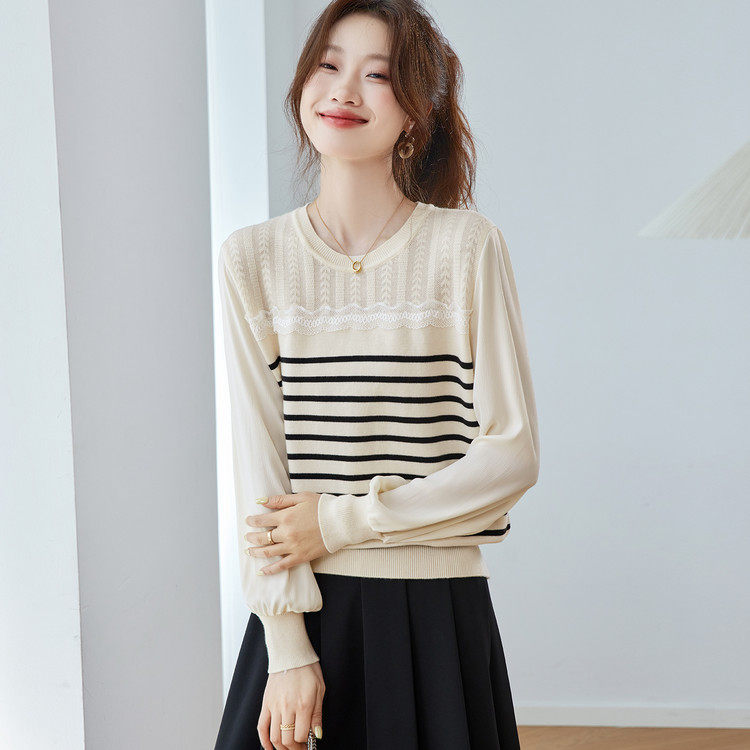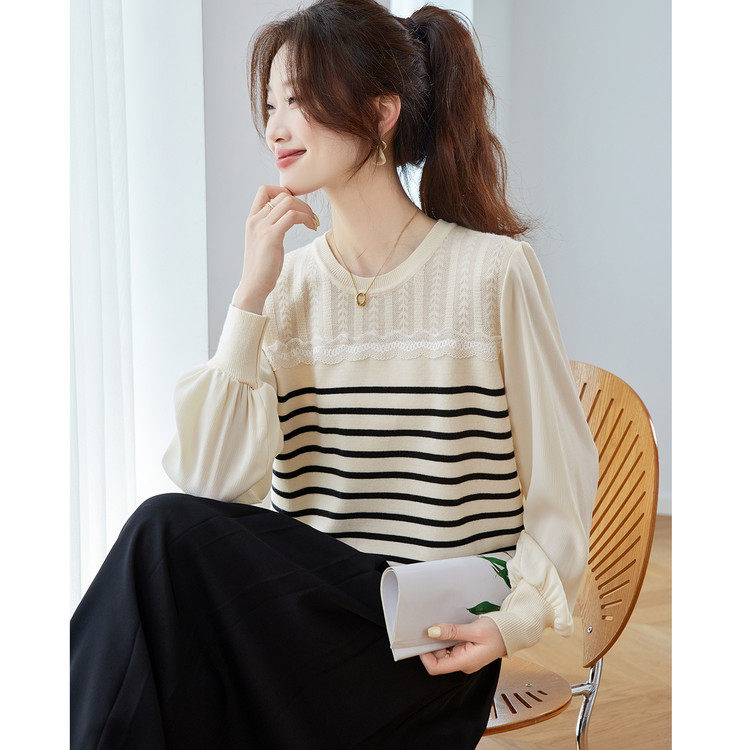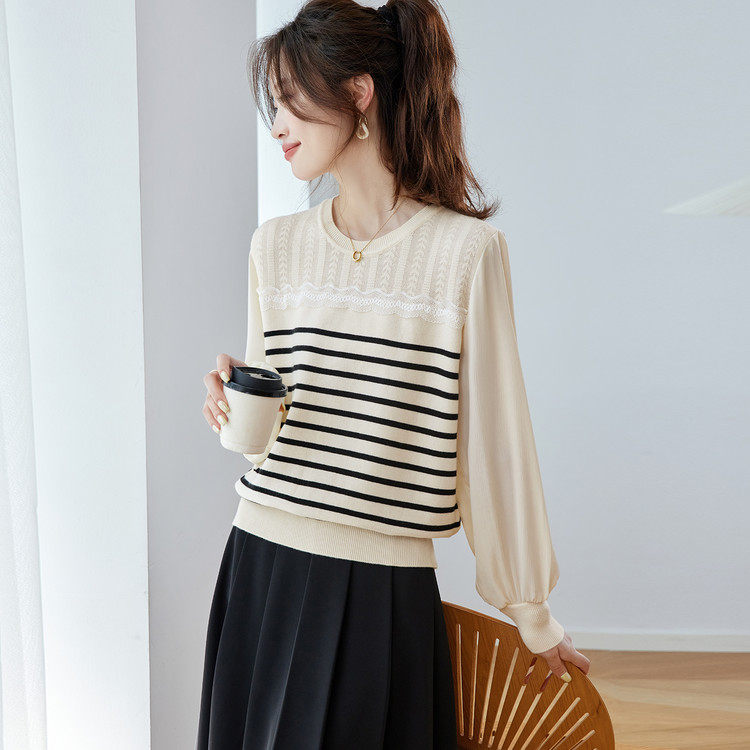 2026新款薄款条纹针织衫女款时尚洋气打底衫上衣宽松显瘦圆领毛衣