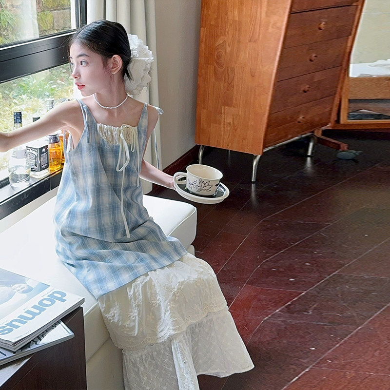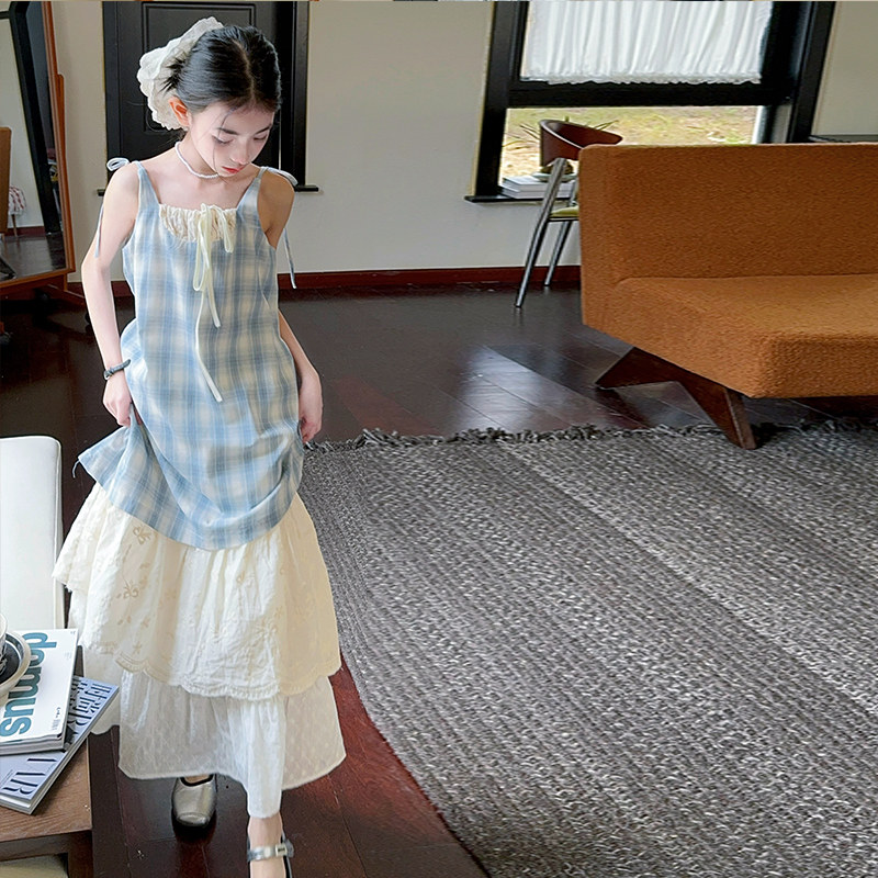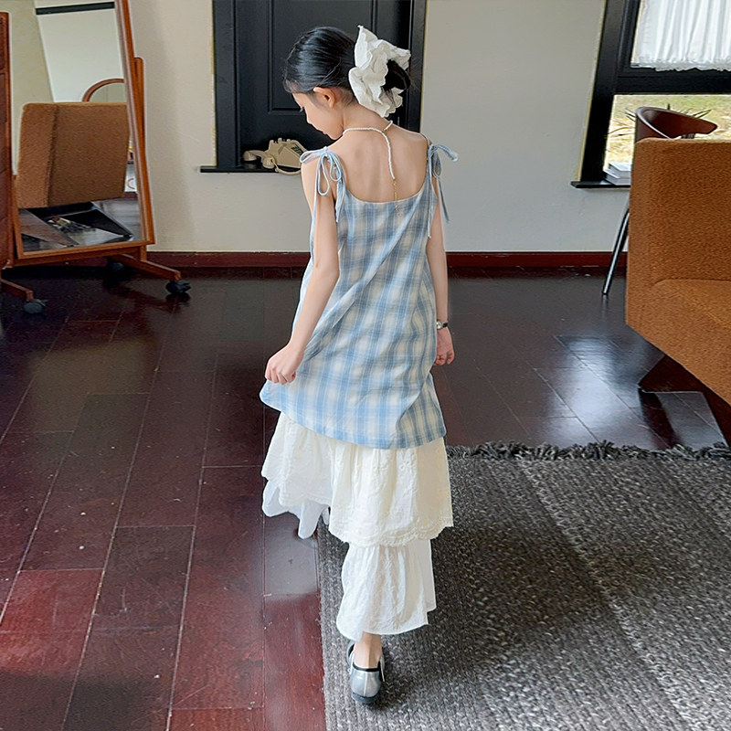 女童蓝色格子吊带裙连衣裙2026新款夏季假两件海边穿搭度假长裙子