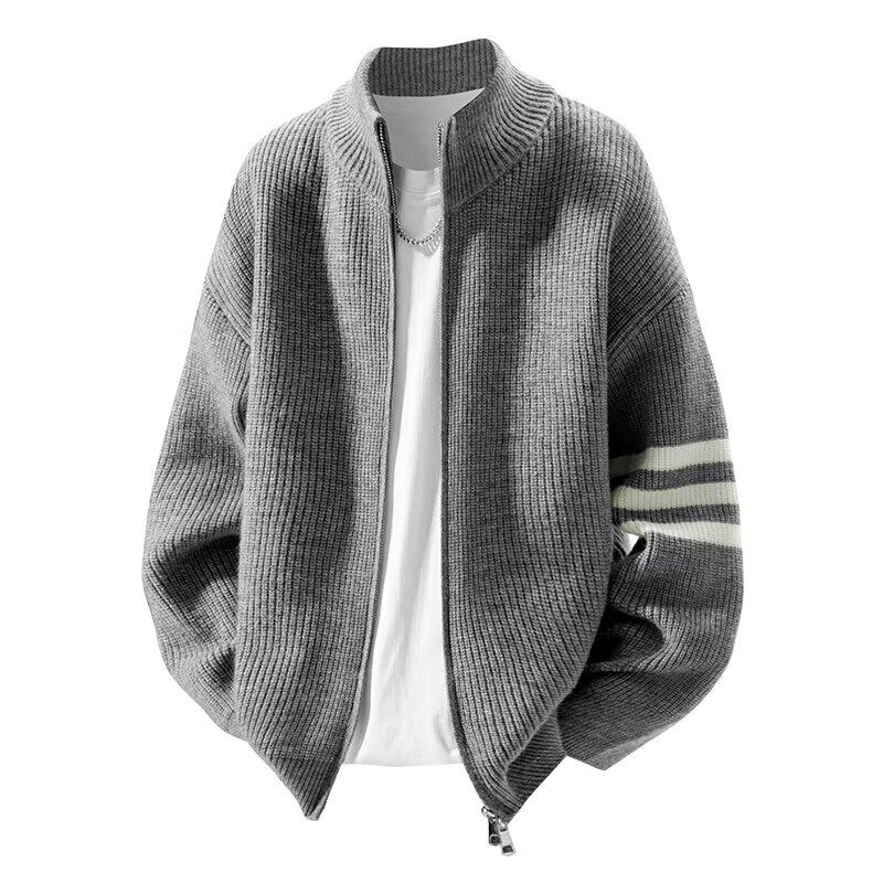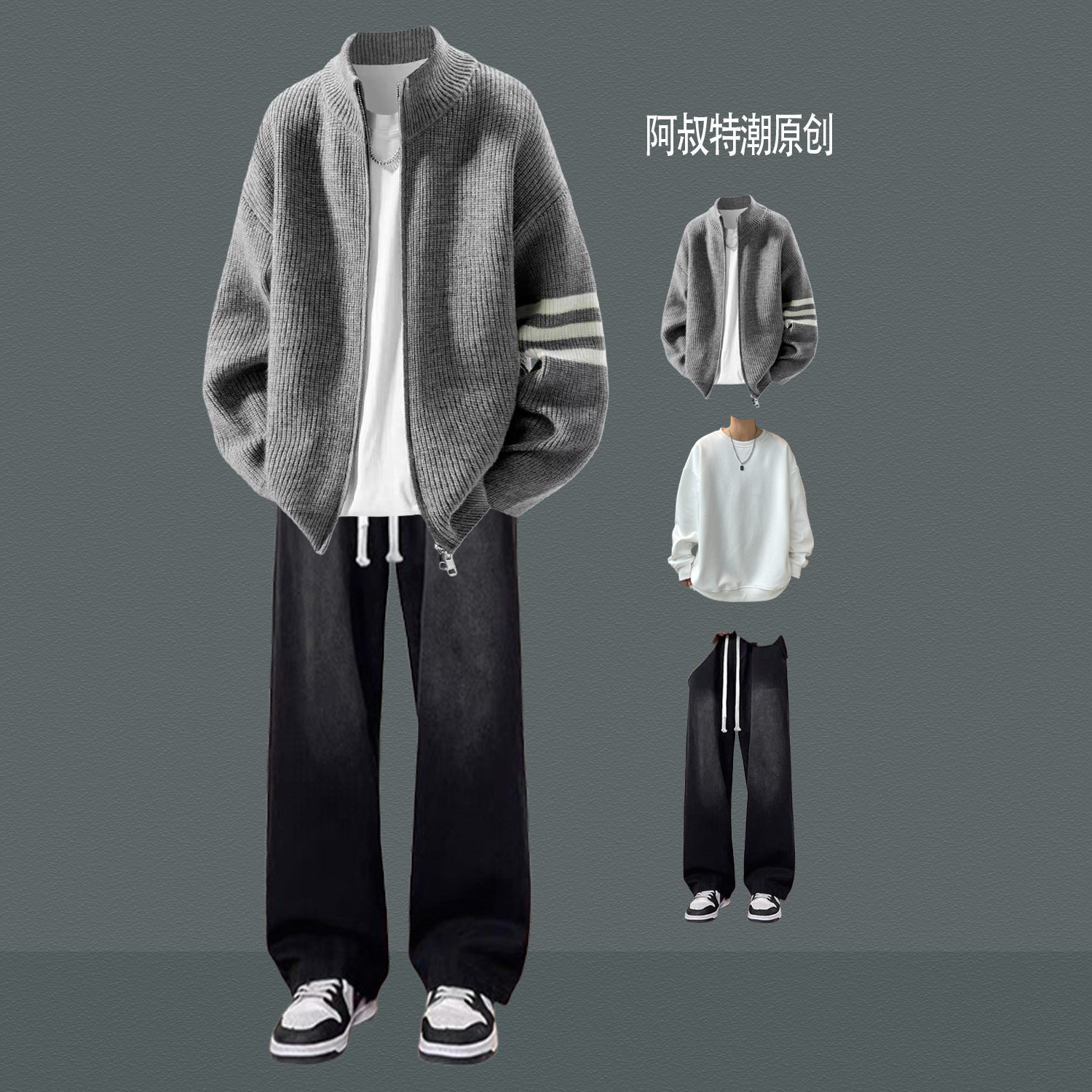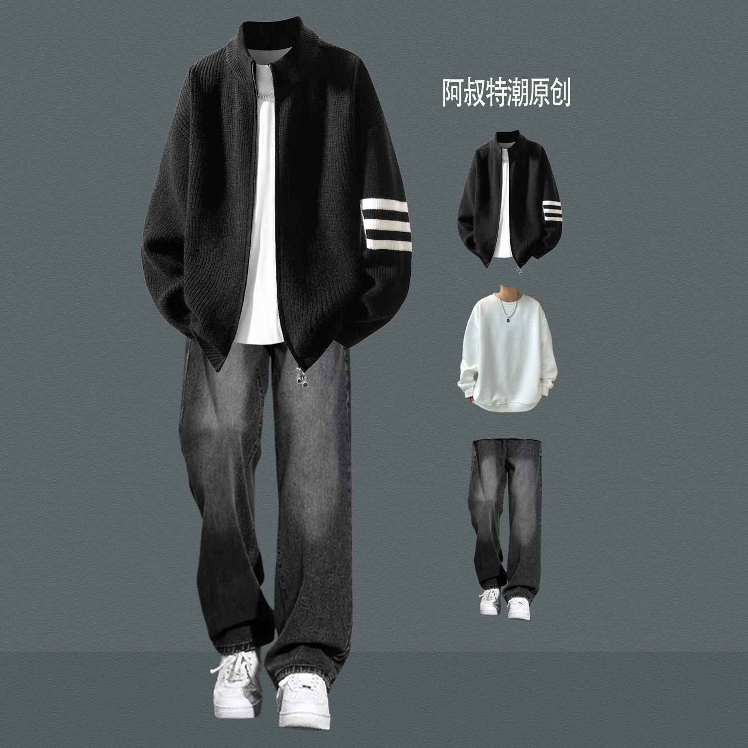 韩式休闲立领针织衫拉链开衫男秋冬款套装条纹酷帅毛衣青少年外套