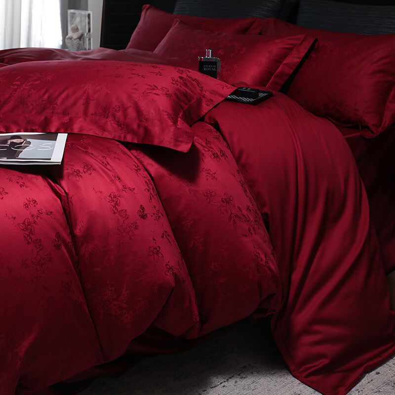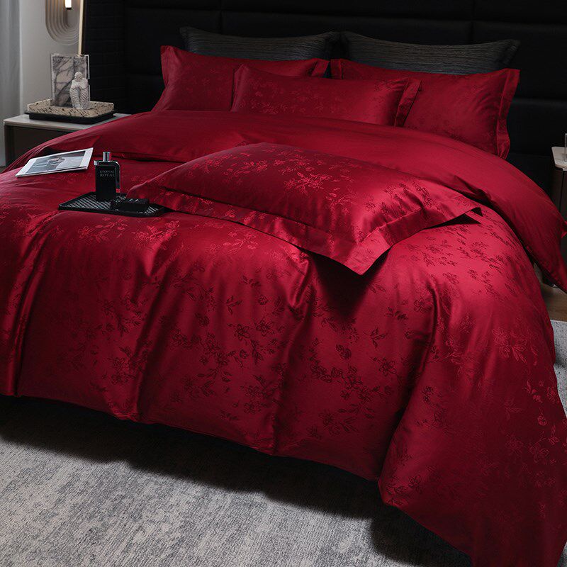 轻奢风婚庆四件套100S长绒棉提花被套酒红色纯棉床单结婚床上用品