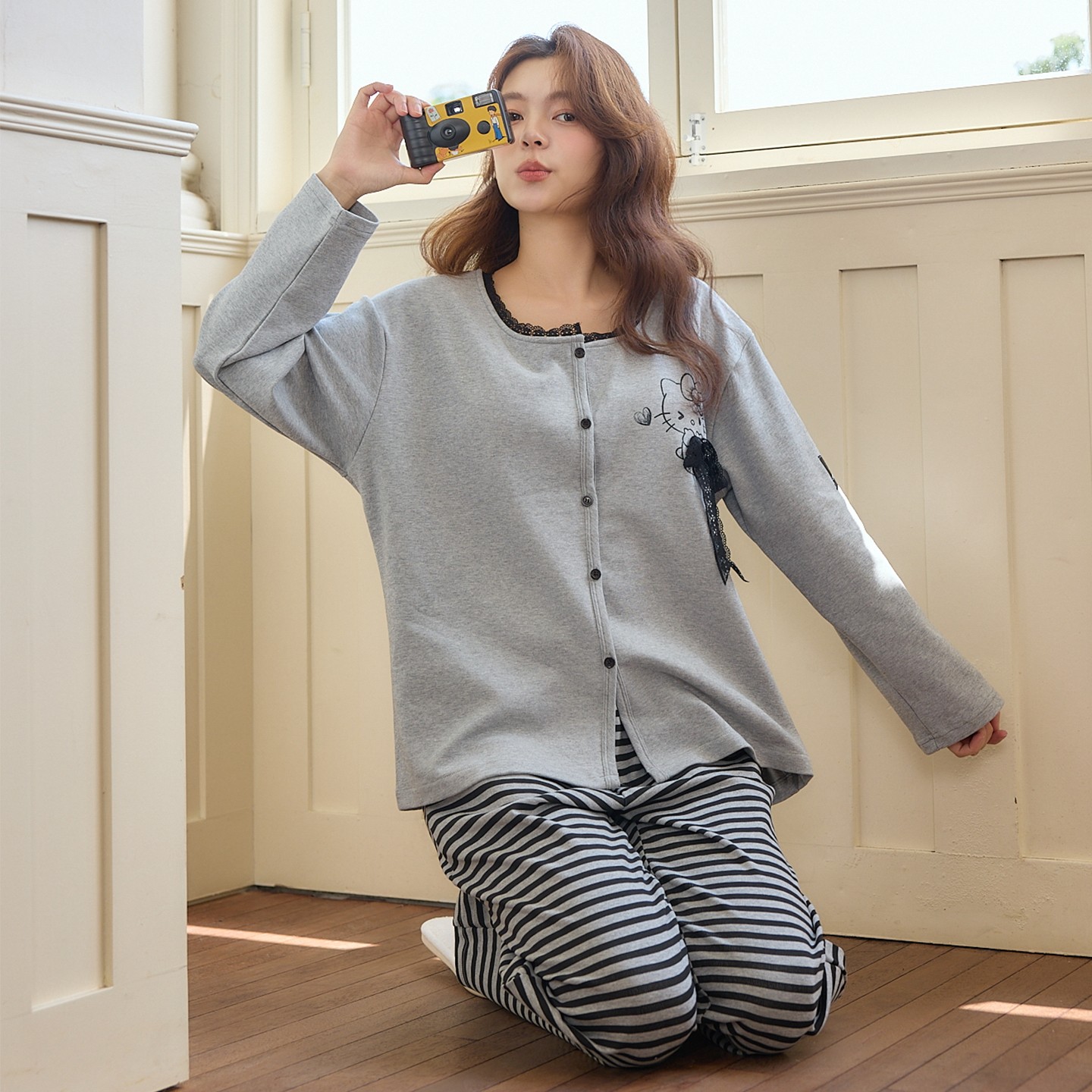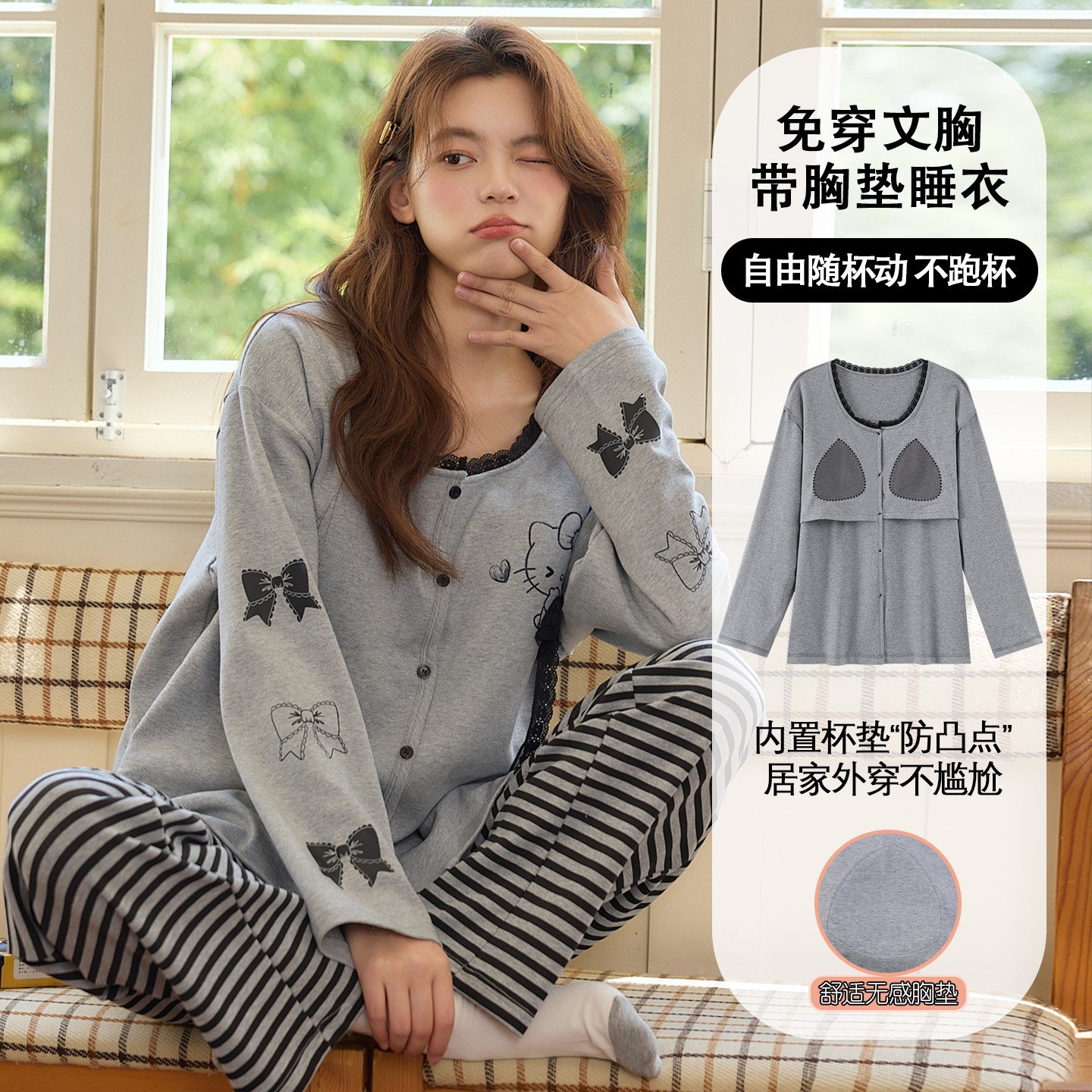 纯棉睡衣女款春秋季带胸垫长袖开衫韩版卡通小猫条纹蝴蝶结家居服