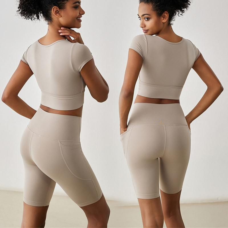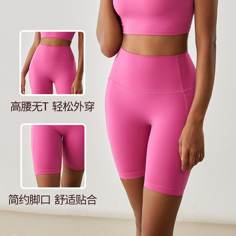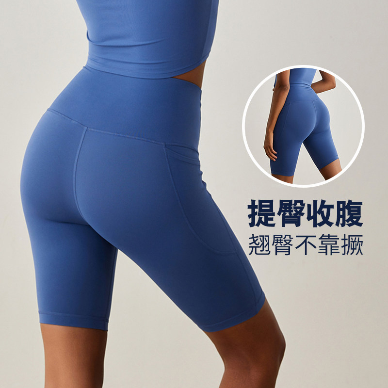 瑜伽五分裤裸感女无T线短裤高弹高腰带口袋提臀塑性透气骑行短裤