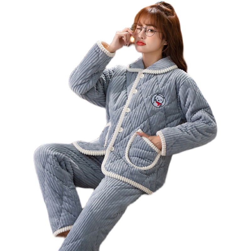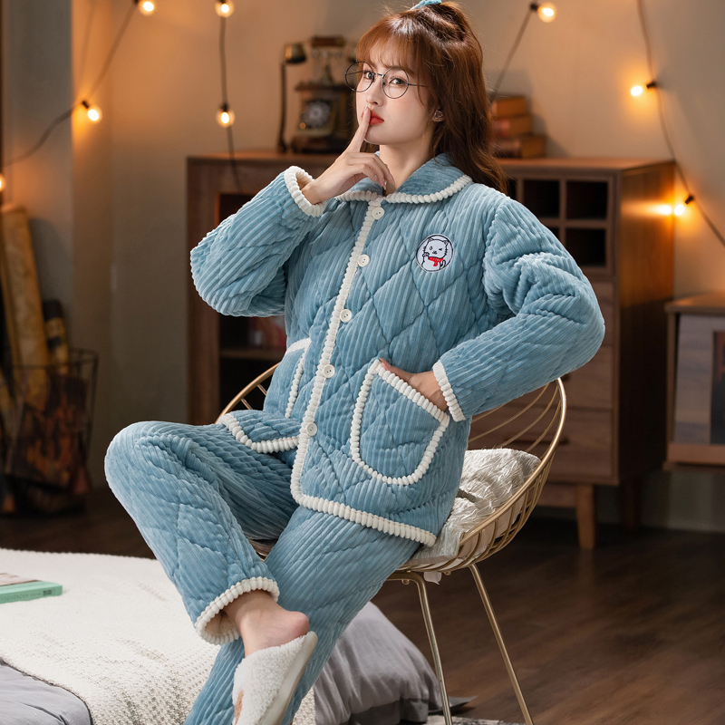 睡衣女冬加厚夹棉大码保暖珊瑚绒三层加绒可外穿棉睡袄家居服套装