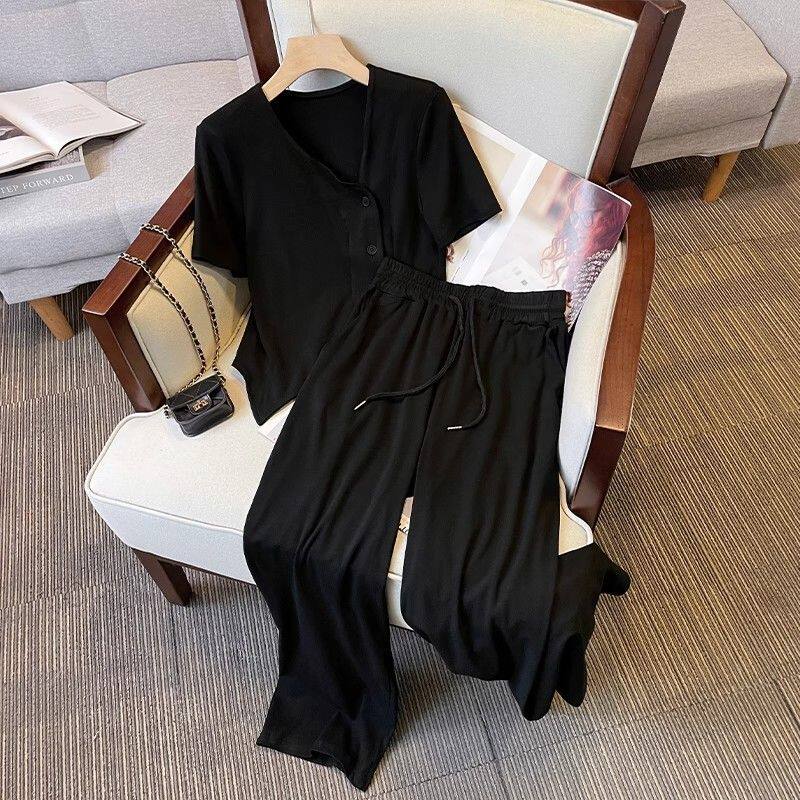 2026夏季新款时尚女装短袖阔腿裤两件套显瘦遮肉休闲慵懒风套装女