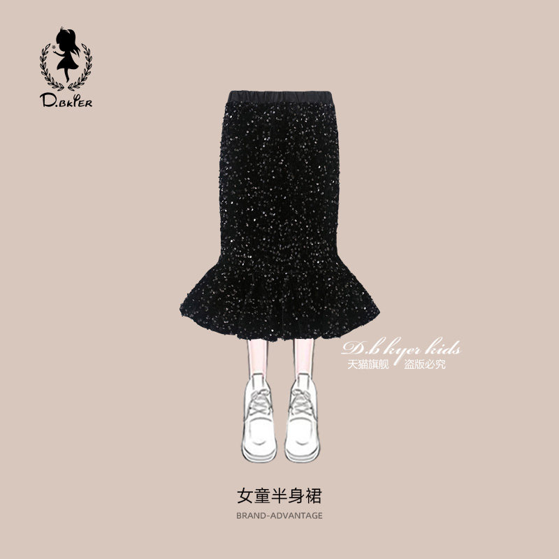 sesameclub女童半身裙长裙春季新款儿童亮片鱼尾裙中大童女孩裙子