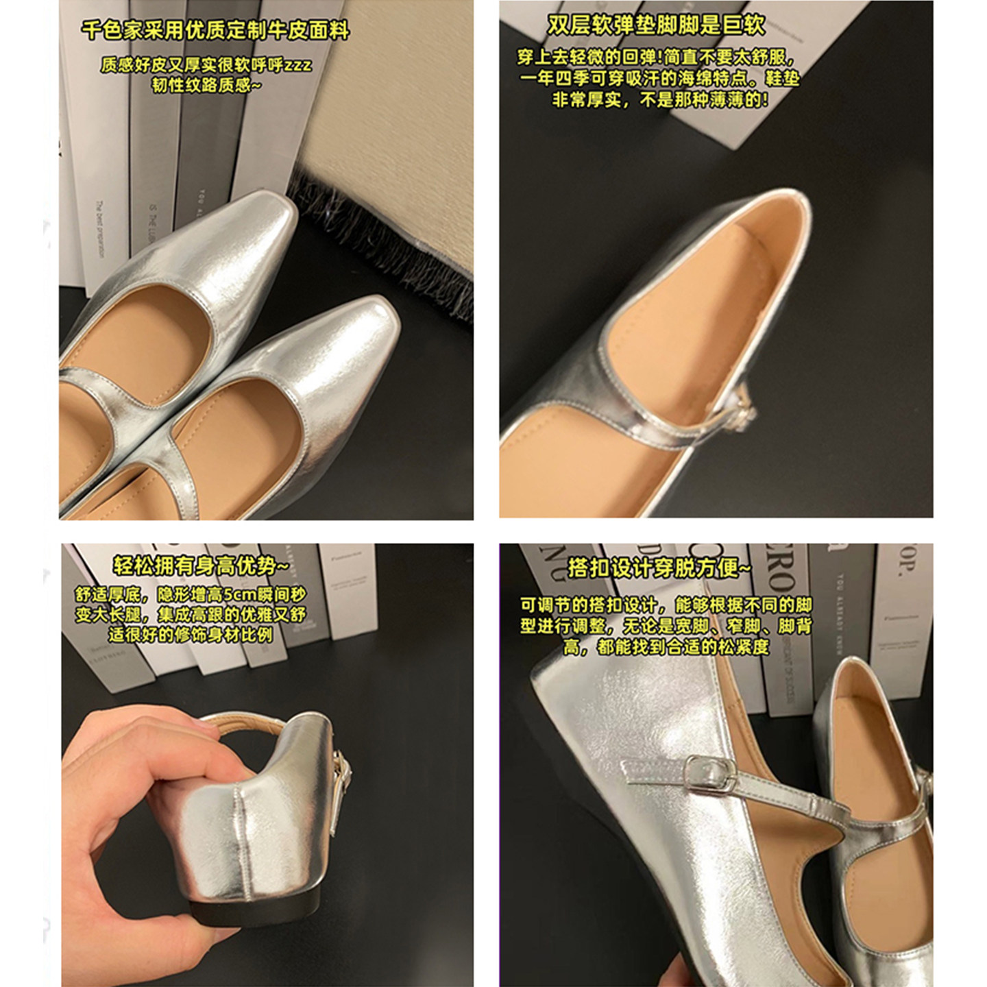 牛皮版~内增高尖头玛丽珍鞋女2025新款一字带法式复古浅口单鞋子