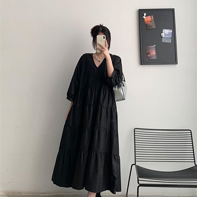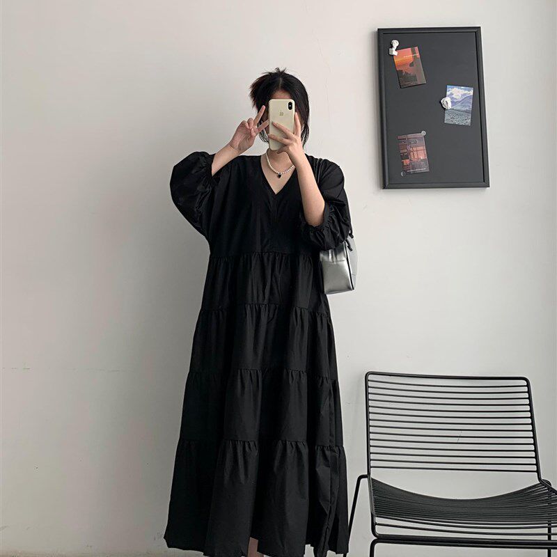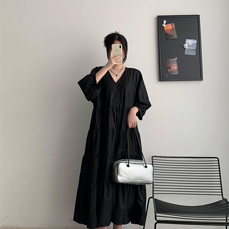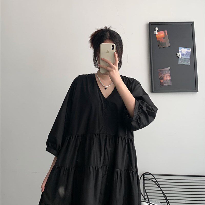 夏季宽松大码女装胖mm法式复古V领显瘦遮肚子连衣裙黑色过膝长裙