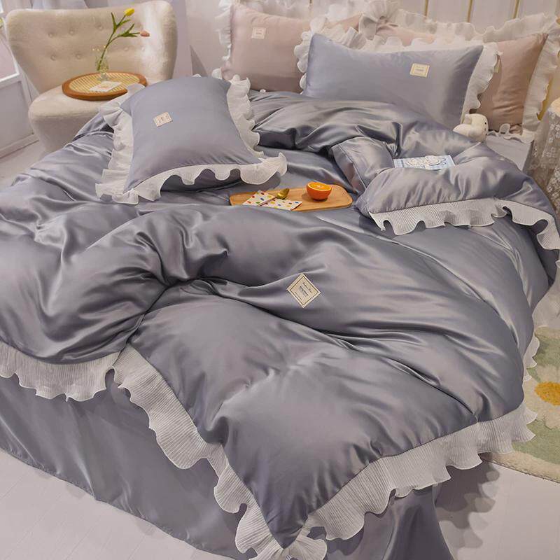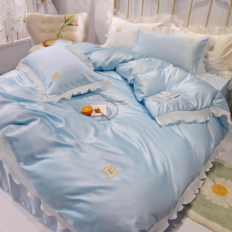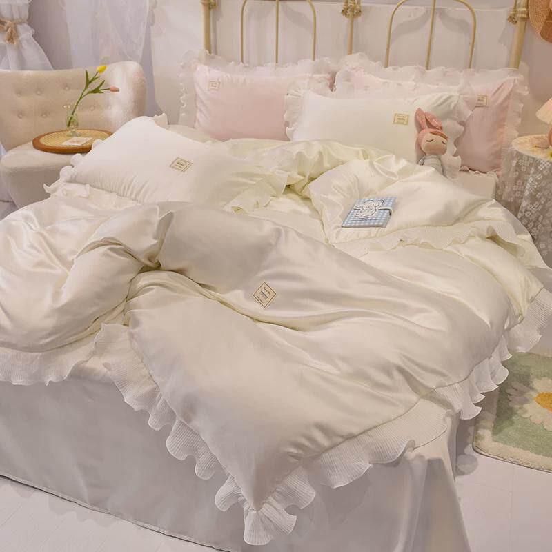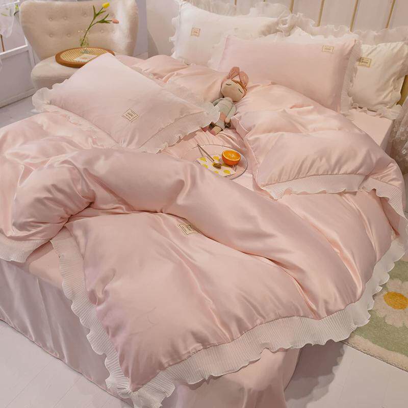 韩式公主风冰丝四件套丝滑夏季裸睡被套床单床上用品粉色被罩夏天