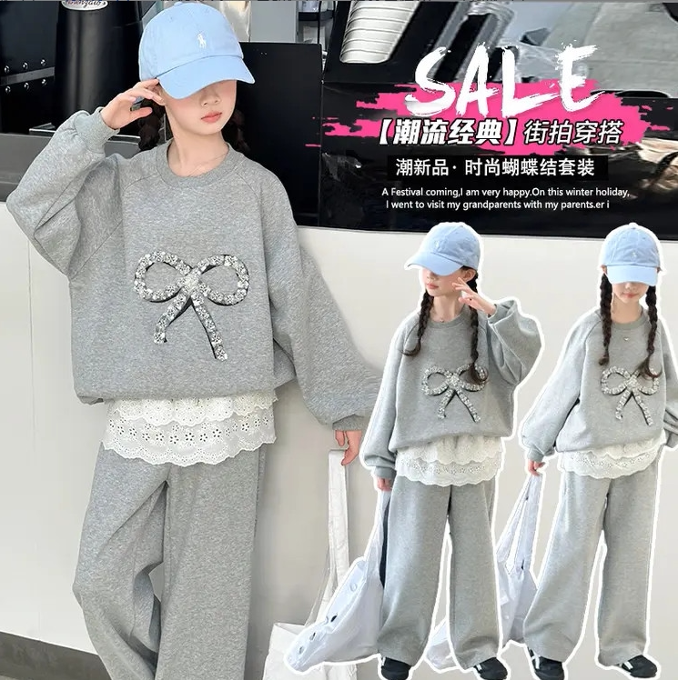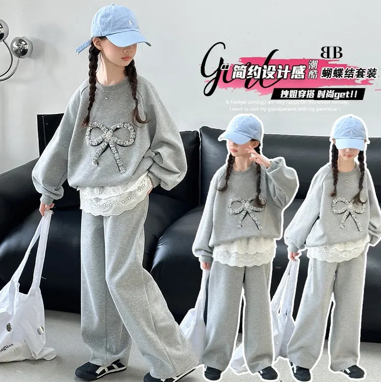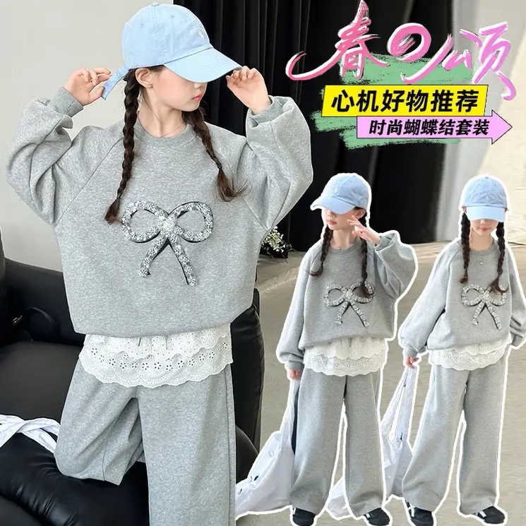 女童春秋套装2026新款中大童韩版蝴蝶结卫衣女孩休闲裤子两件套潮