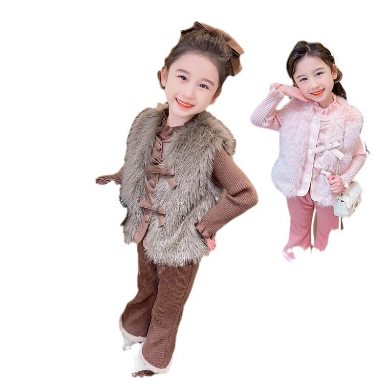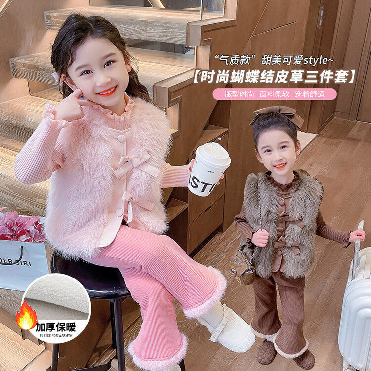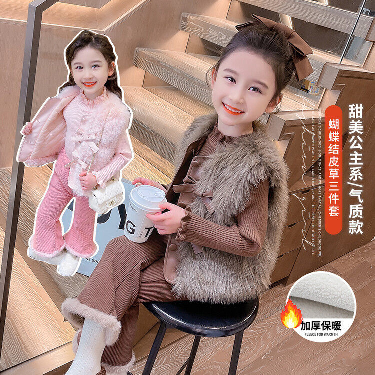 女童皮草马甲三件套双蝴蝶马甲+花边领毛衣+毛边裤子洋气三件套