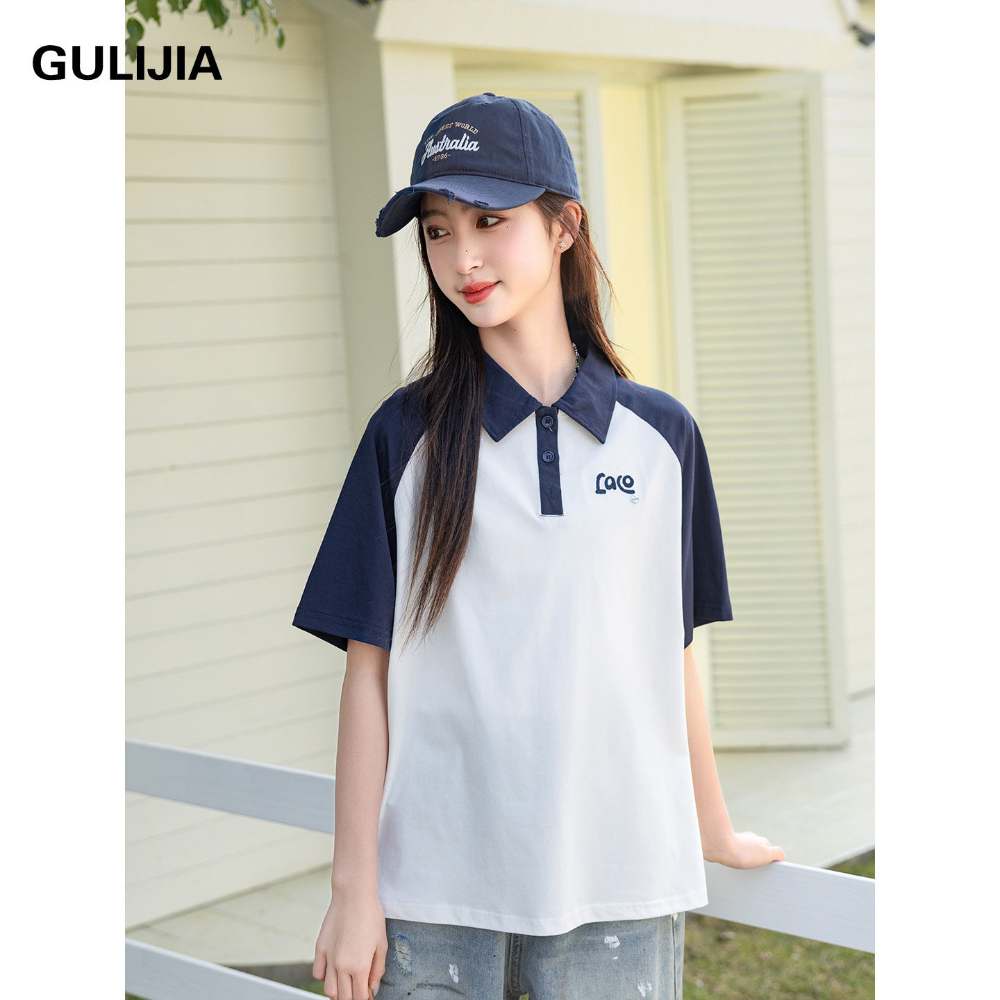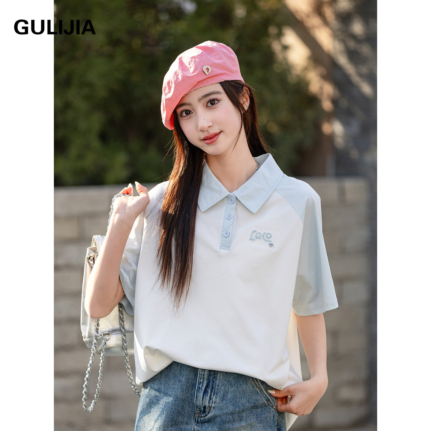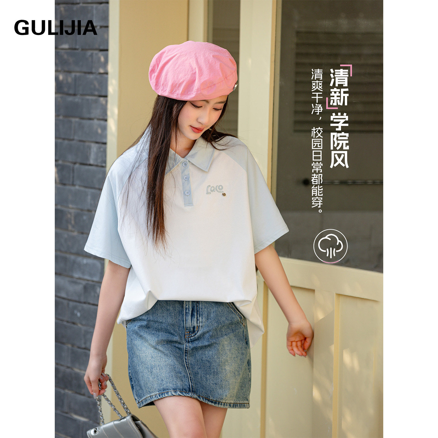 古力家学院风翻领POLO衫女大童短袖上衣夏季宽松T恤初中生体恤衫