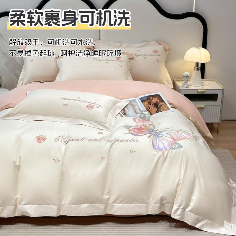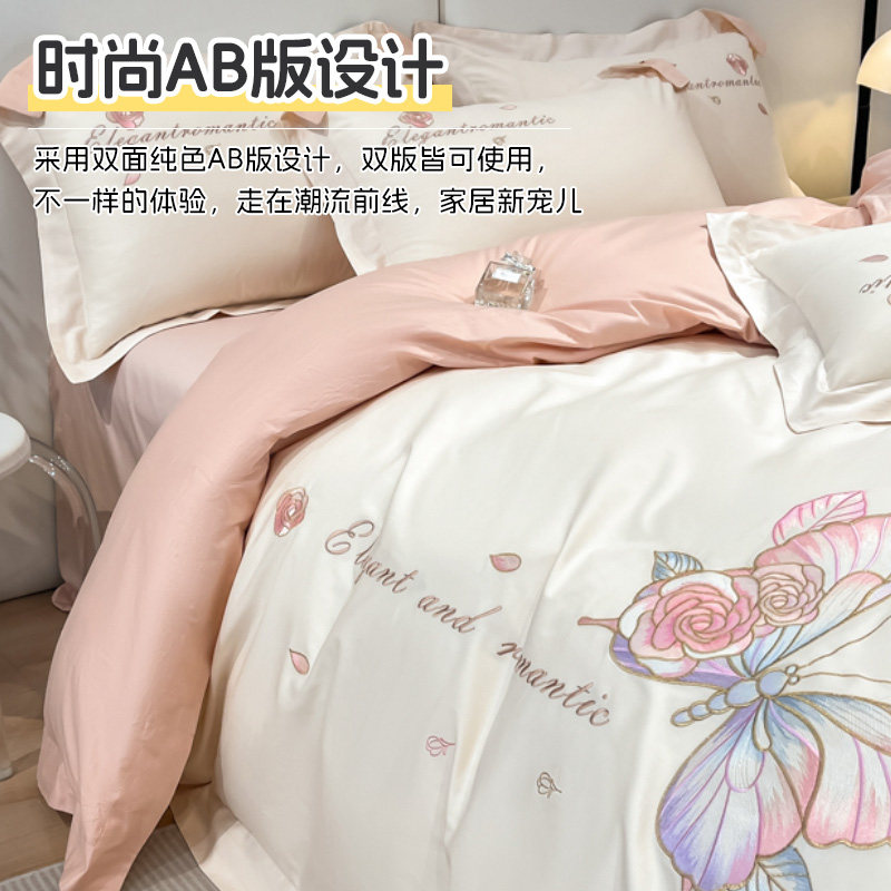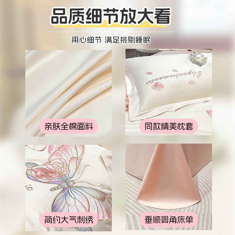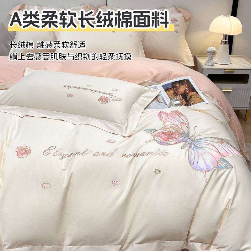 2026新款纯棉全棉长绒棉绣花四件套纯色床单笠款套件床上用品