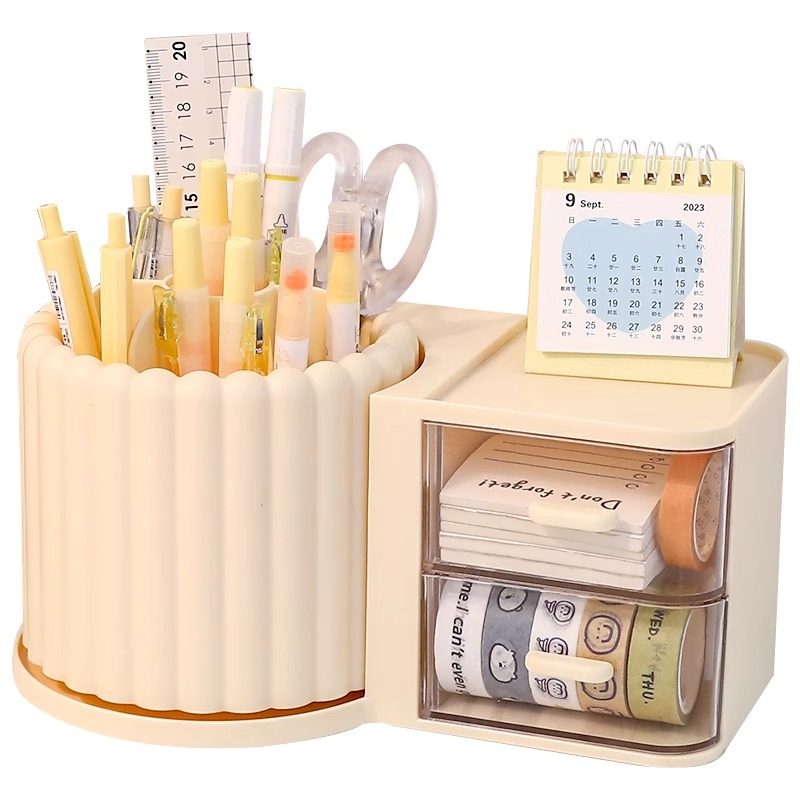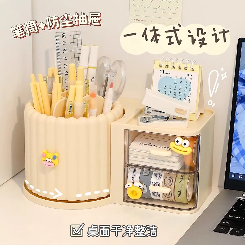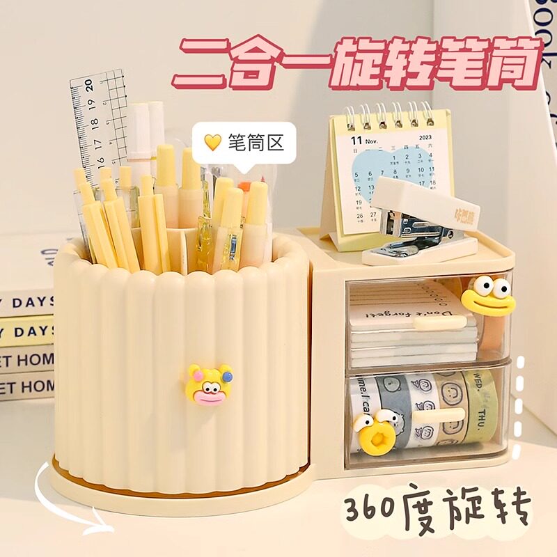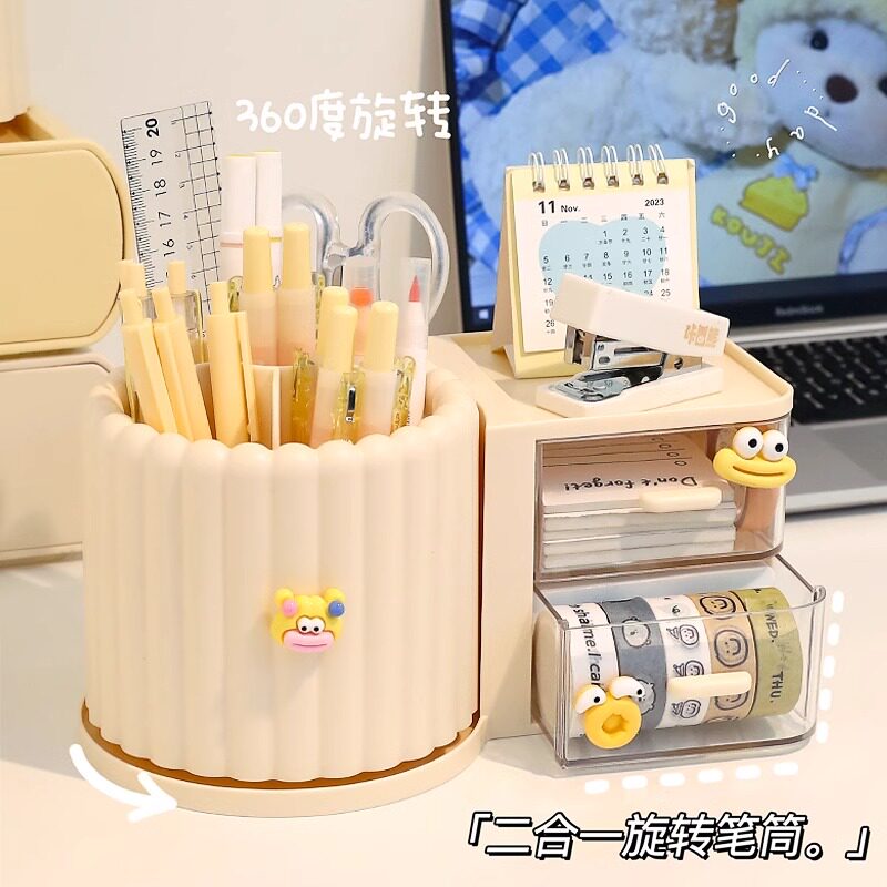 旋转笔筒桌面收纳盒大容量抽屉式学生书房书桌创意可爱多功能笔桶