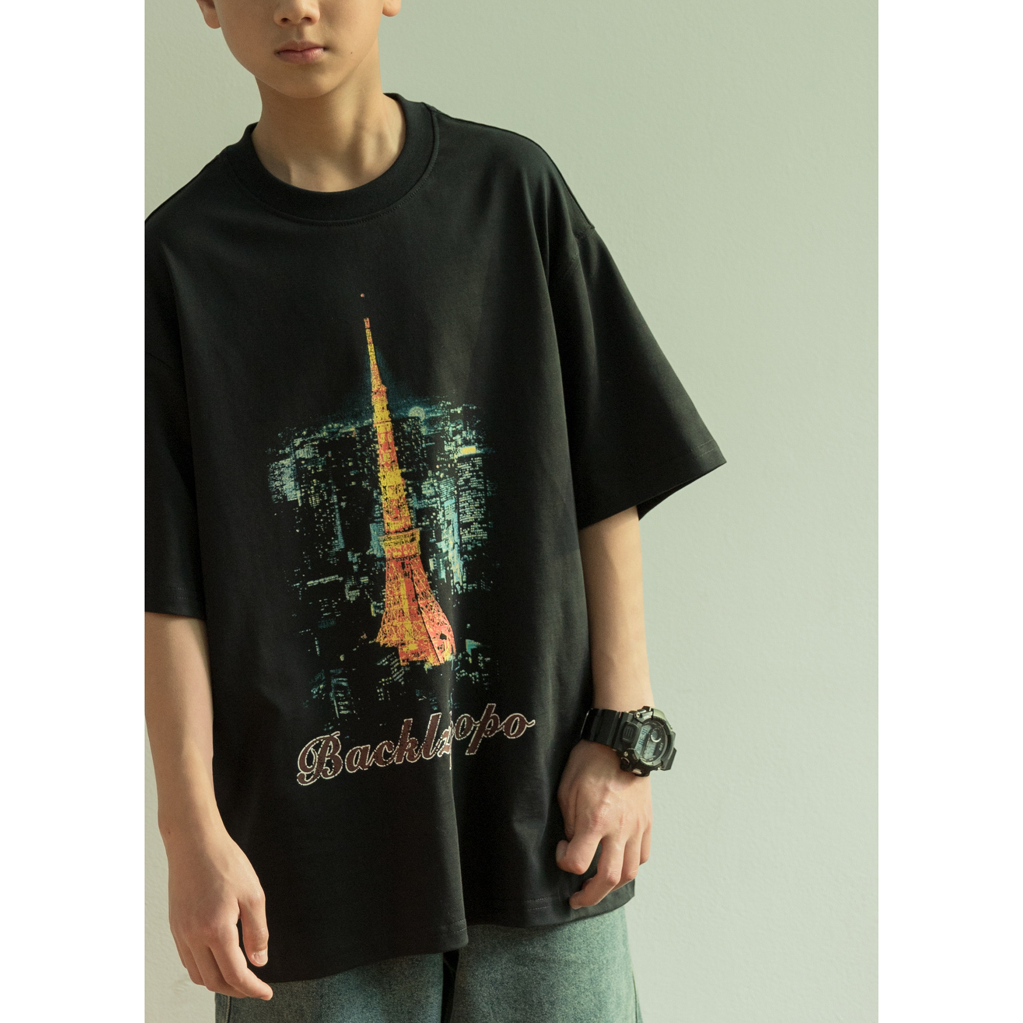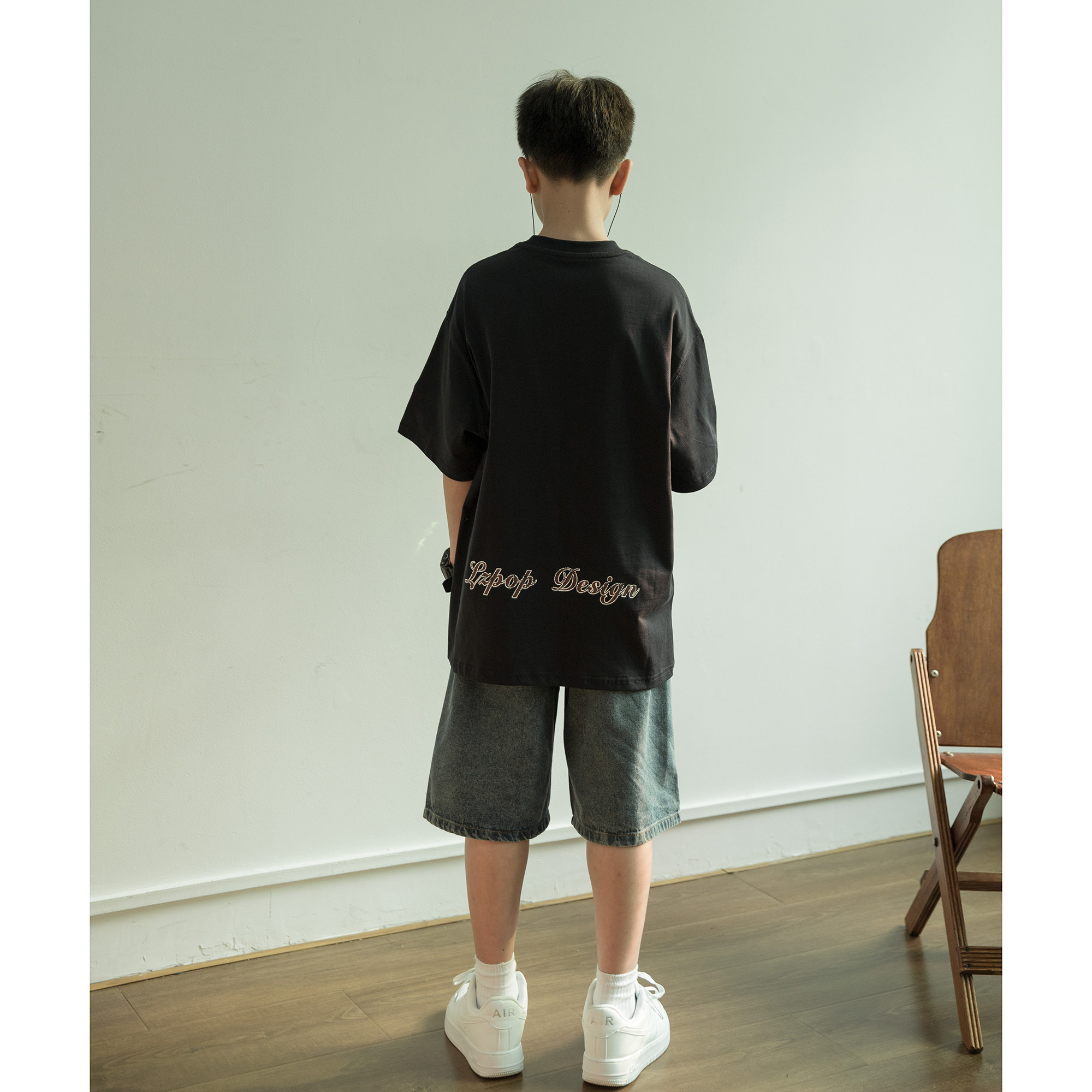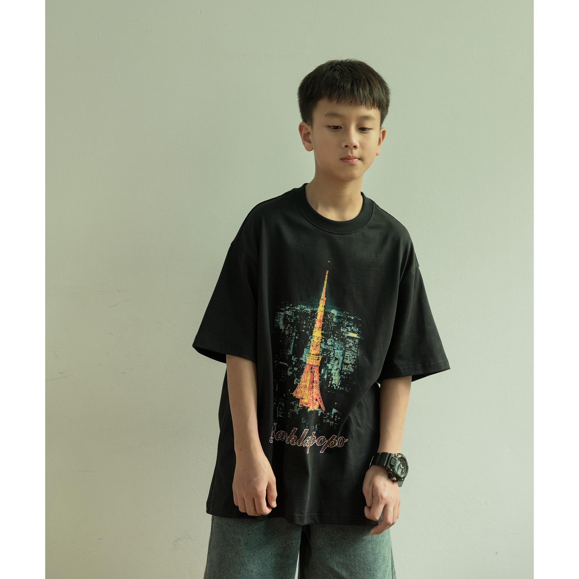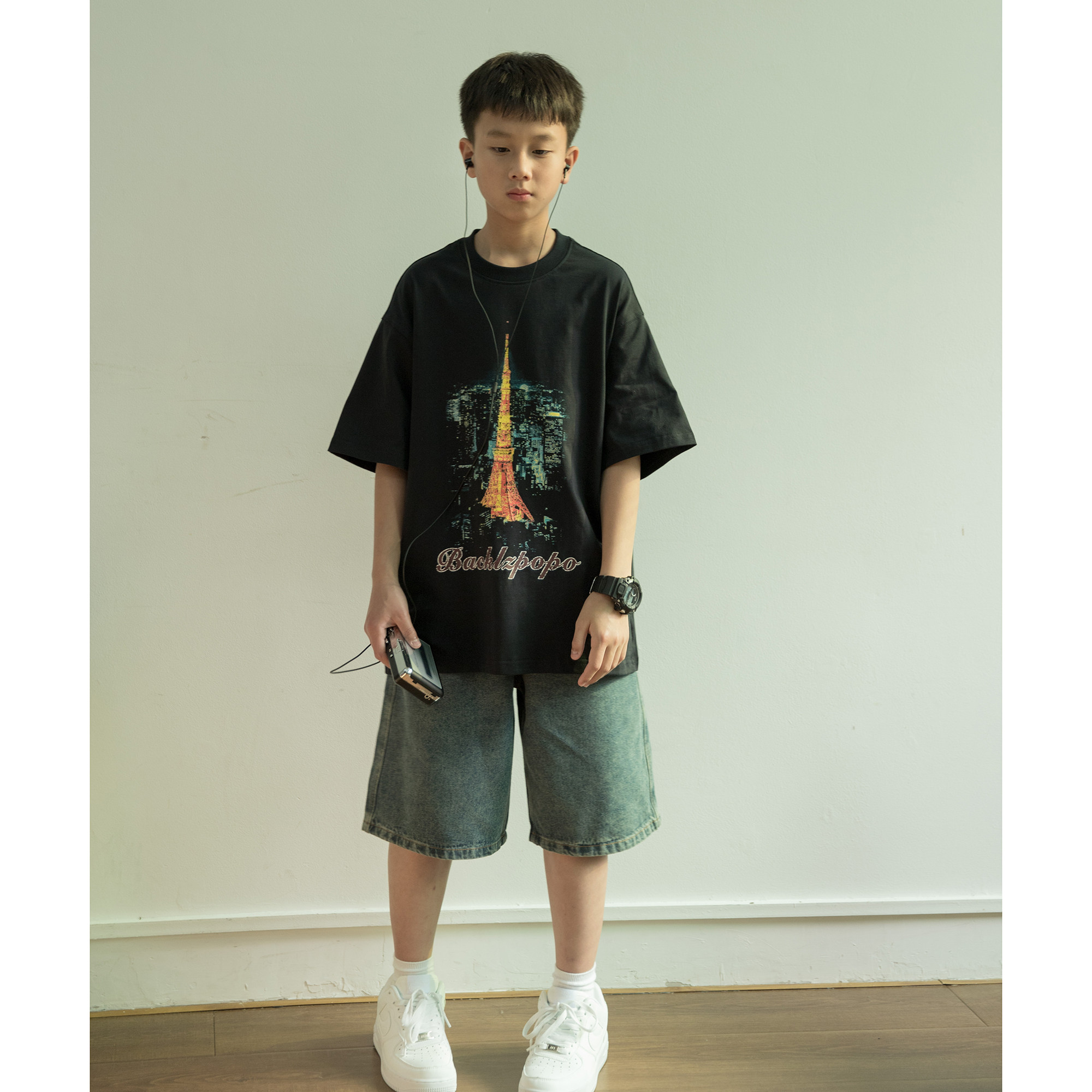 男孩黑色短袖T恤2026夏季新款铁塔纯棉上衣大童青少年圆领薄体恤