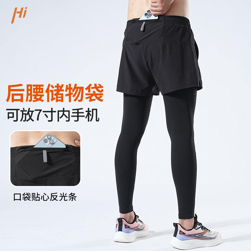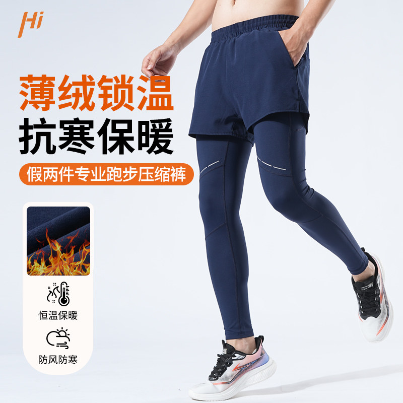 王后卫秋冬加绒假两件紧身长裤多口袋男士跑步运动裤压缩两件套