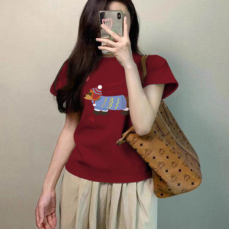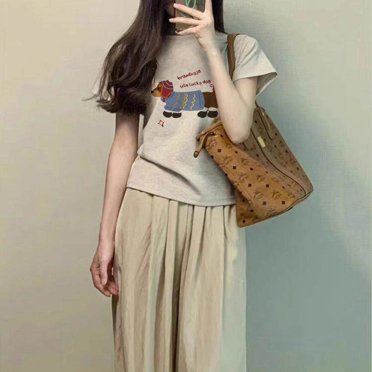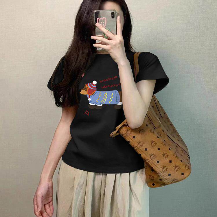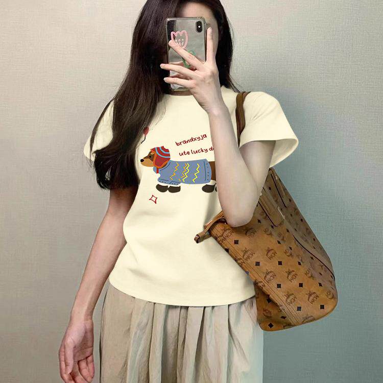 腊肠小狗印花t恤女款2026夏季新款小众正肩棉短款修身短袖上衣tee