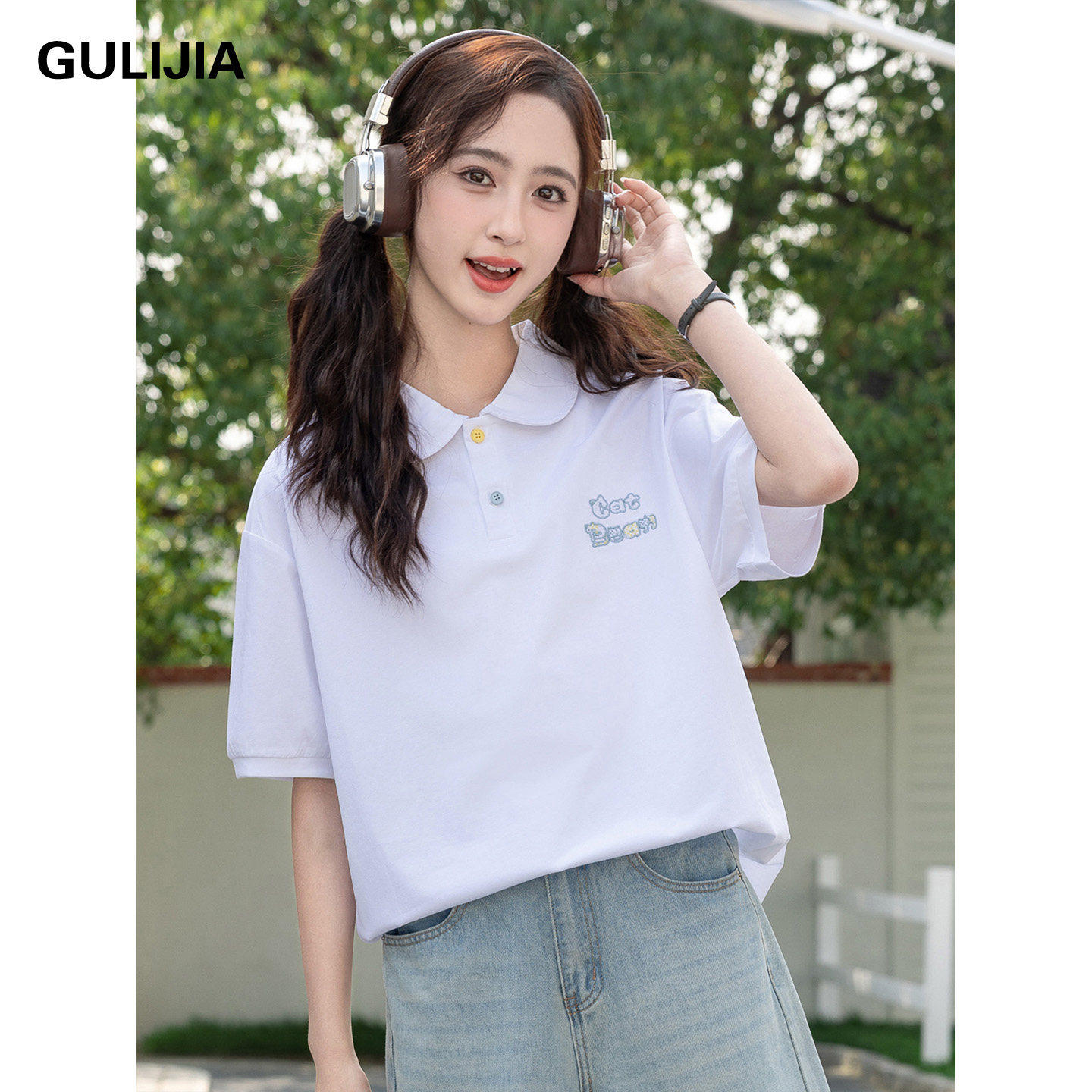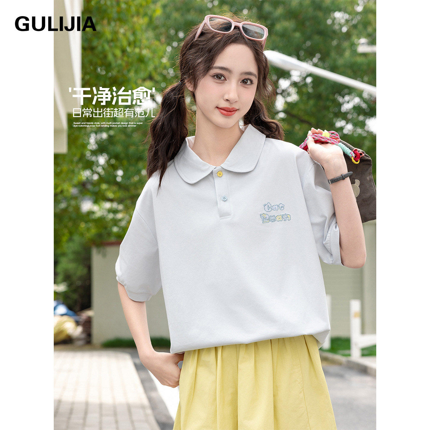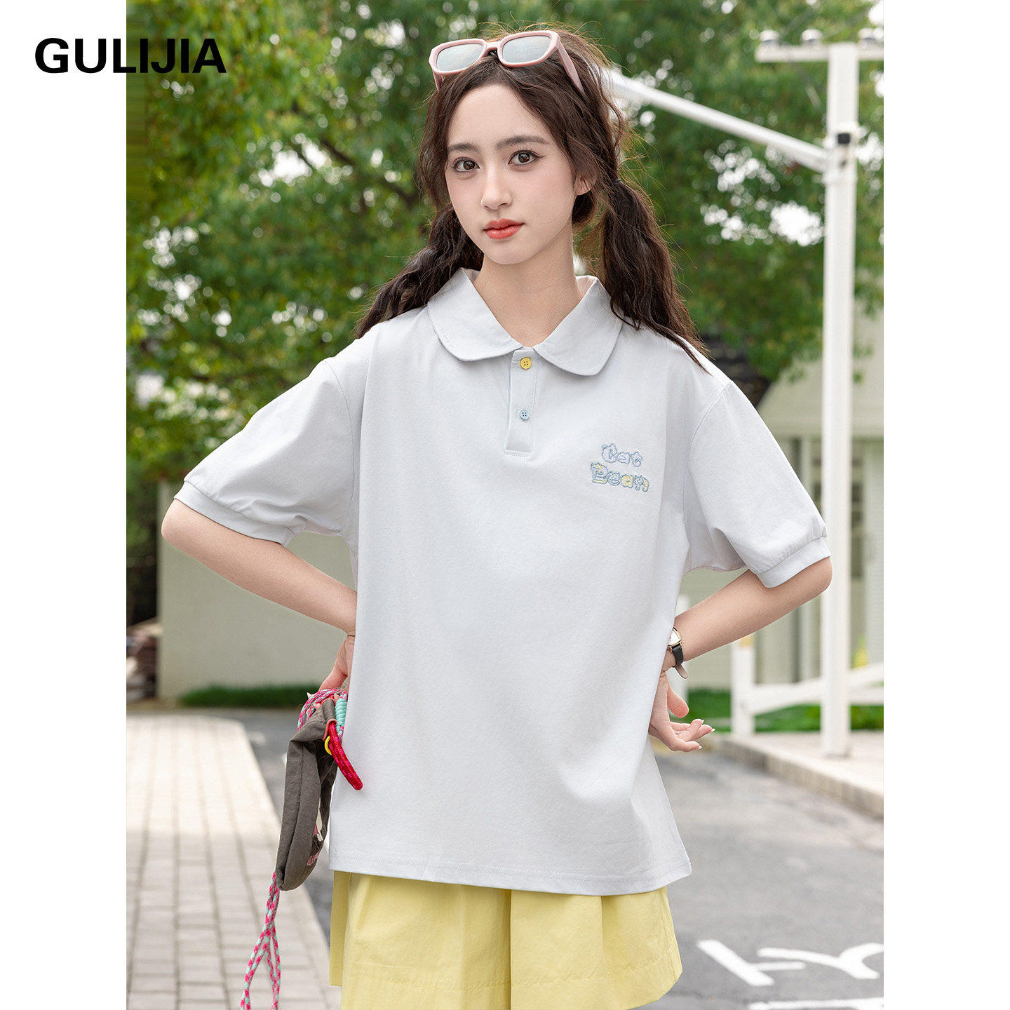 优蜜屋夏款翻领刺绣POLO衫短袖T恤女大童夏装宽松初中生纯棉上衣