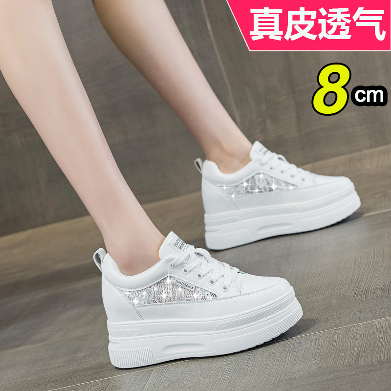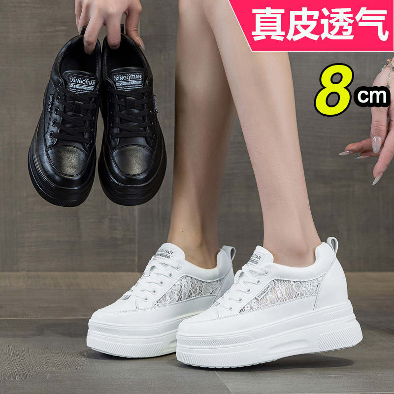 小白鞋女夏天透气内增高女鞋8cm真皮板鞋厚底松糕休闲鞋高跟网鞋