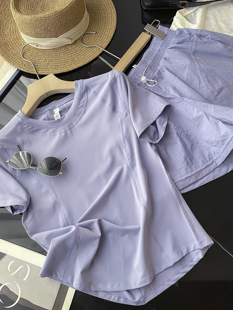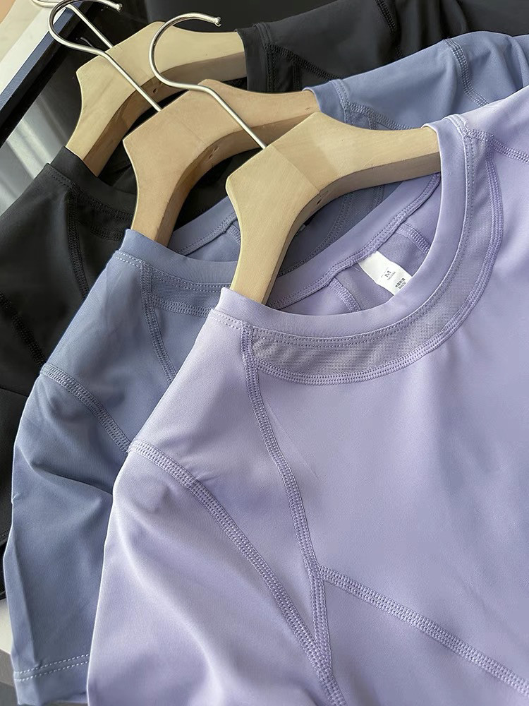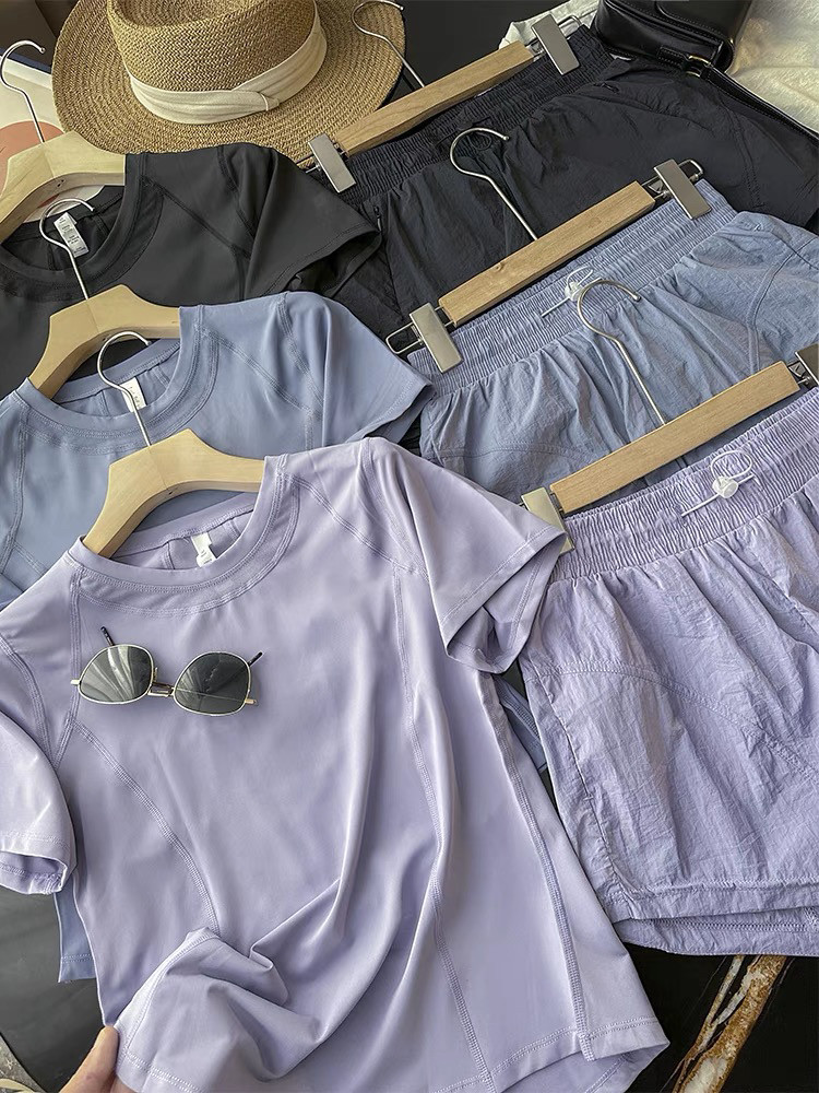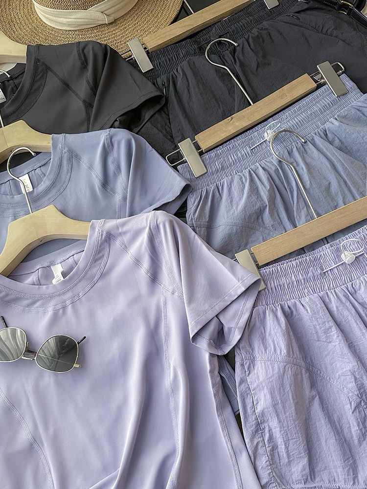 强烈推!LU家代工厂!后背网纱设计透气排汗圆领短袖短裤瑜伽套装