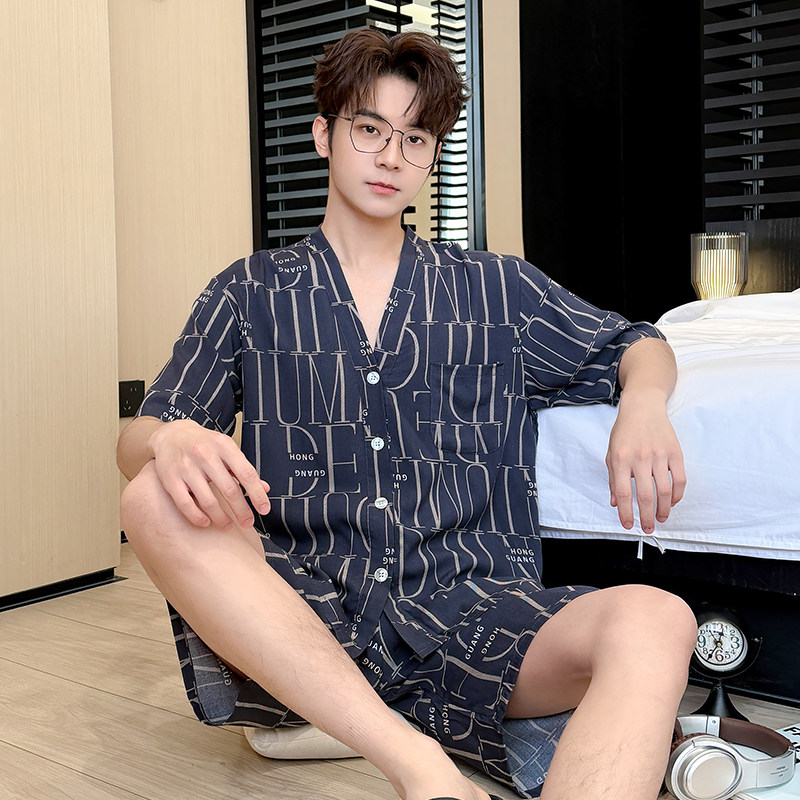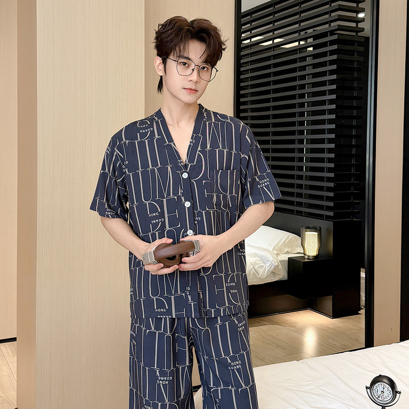 夏季新款短袖棉绸睡衣加大码宽松家居服套装男款透气人造棉家居服